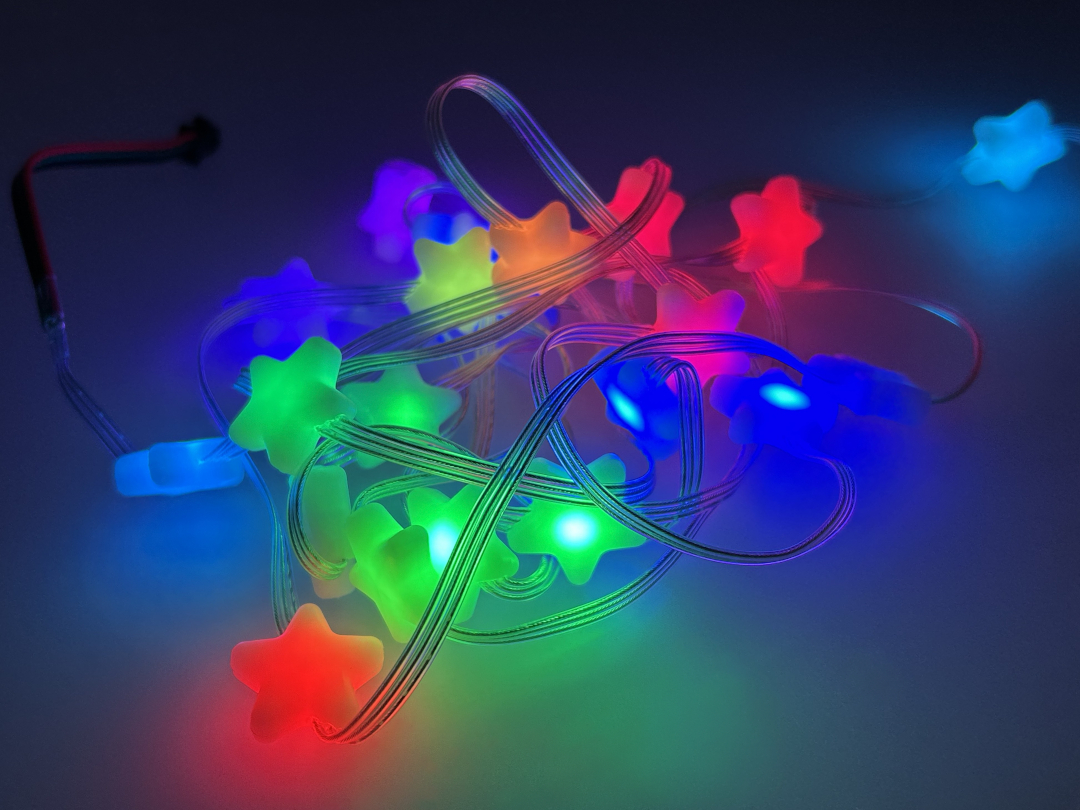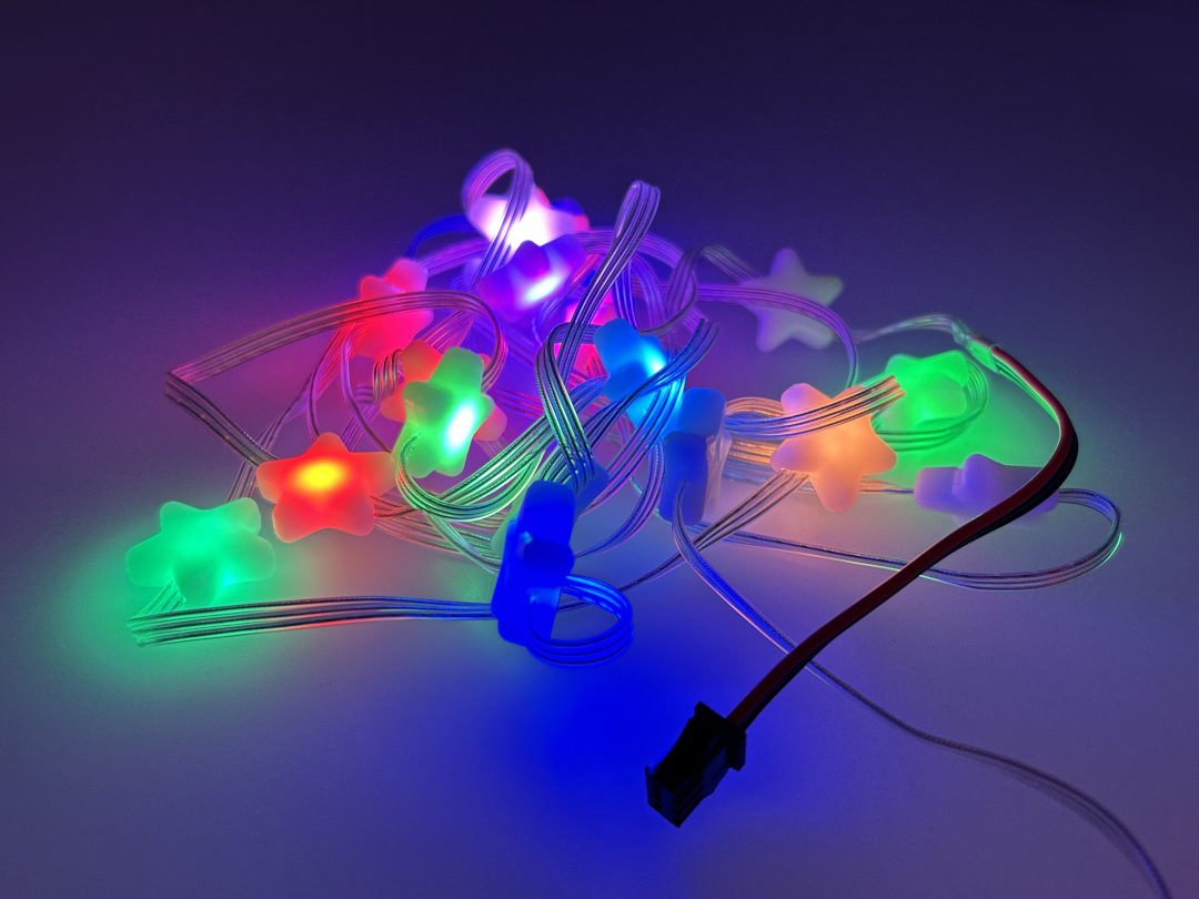 Adafruit NeoPixel Star Strand je unikátní pole 20 RGB LED diod ve tvaru pěticípých hvězd . Každá hvězda obsahuje jednu NeoPixel LED (typ 5050) s vestavěným mikrokontrolérem pro přesné řízení barev. LED diody jsou namontovány na 3metrovém flexibilním kabelu a konektory JST SM umožňují snadné připojení více polí. Je to ideální volba pro kostýmní, jevištní a dekorativní projekty.