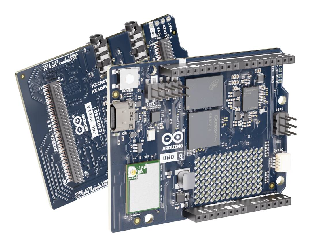 Nosič médií Arduino UNO snadno přidává vysoce kvalitní video a audio podporu pro desky Arduino UNO Q a VENTUNO Q.