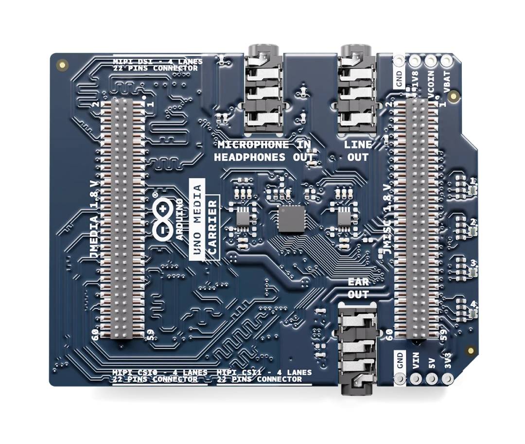 Deska Arduino UNO Media Carrier je navržena pro rychlé rozšíření desek UNO Q a VENTUNO Q o vysoce kvalitní video a audio. Modul se připojuje k základní desce pomocí konektorů JMEDIA a JMISC , které díky svému průchozímu provedení umožňují stohování modulů bez blokování pinů hlavní jednotky. Obsahuje dva 22pinové 4pásmové konektory MIPI CSI pro kameru , jeden 22pinový 4pásmový konektor MIPI DSI pro displej a tři 3,5mm jacky . Toto řešení je ideální pro vytváření systémů umělé inteligence, zařízení HMI, interaktivních instalací a prototypů produktů s využitím video a audio analýzy.