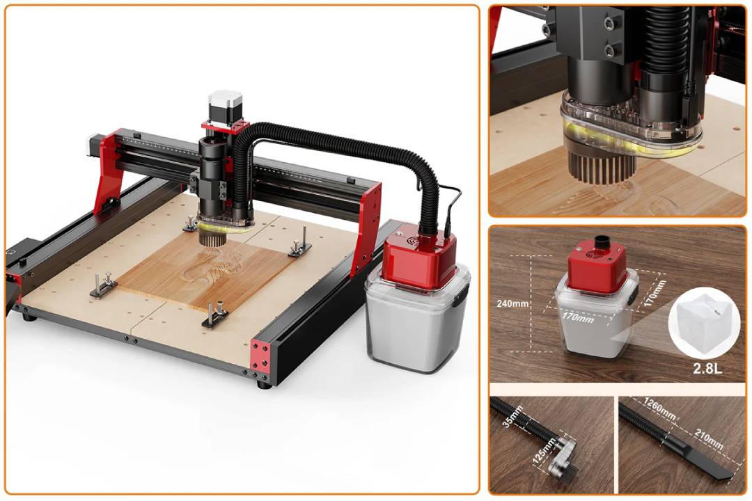 Frézka v kombinaci s volitelným systémem odsávání prachu účinně snižuje množství prachu vznikajícího během řezání a gravírování a udržuje tak pracoviště čisté.