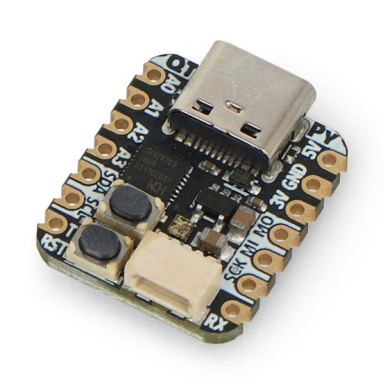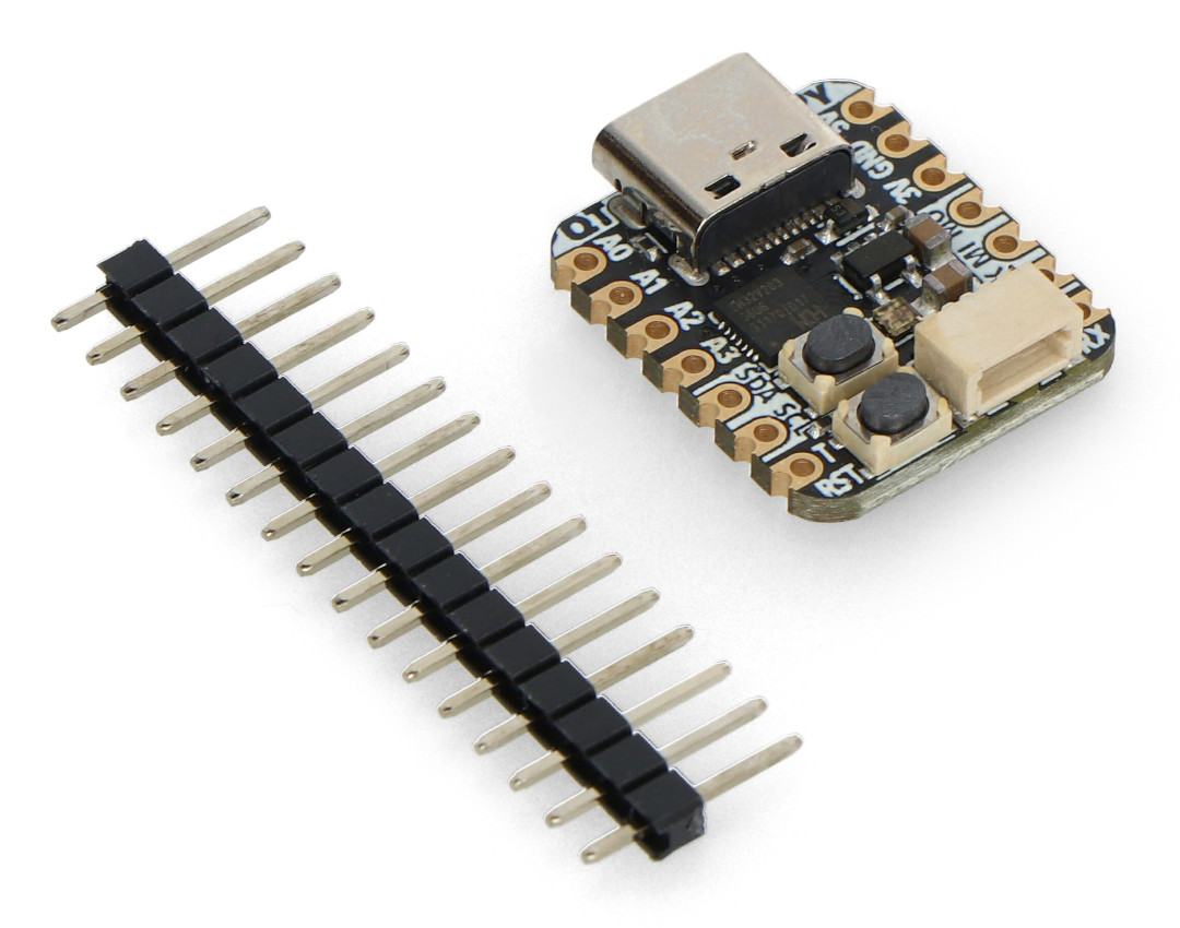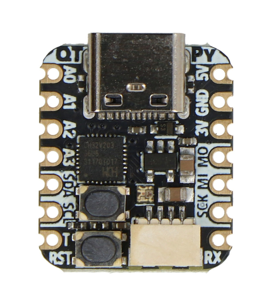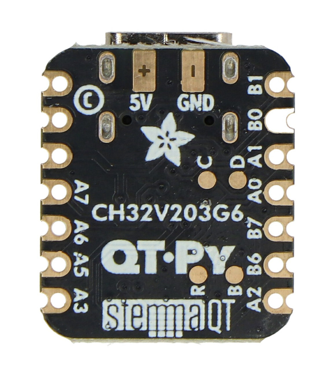QT Py CH32V203 od Adafruit je malá, ale výkonná deska navržená ve formátu Seeed Xiao . Je vybavena konektorem USB Type-C pro napájení a programování, konektorem STEMMA QT ideálním pro I2C senzory , adresovatelnou NeoPixel RGB LED a tlačítky pro snadný přístup k bootloaderu bez dalšího programátoru. Procesor CH32V203G6 nabízí 32bitovou architekturu, jednocyklové násobení/dělení, 10KB SRAM a 256KB Flash paměti (32KB interní + 224KB externí) – dostatek pro mnoho pokročilých projektů založených na USB.