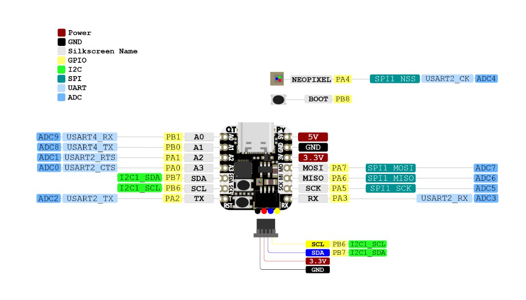 - I2C: SCL (PB6) a SDA (PB7) – slouží pro komunikaci se senzory a moduly I2C; jsou také připojeny ke konektoru STEMMA QT