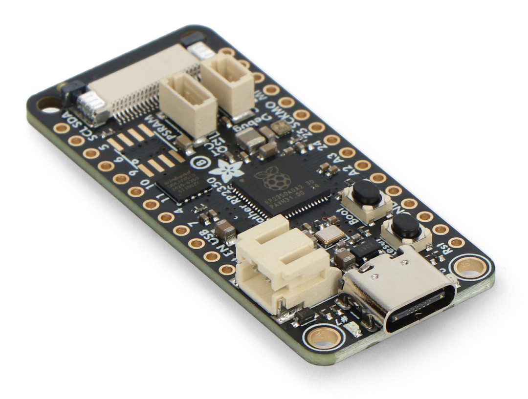 Deska nabízí 29 GPIO pinů , z nichž 21 je na standardním Feather konektoru a dalších 8 na konektoru HSTX. Každý pin má řadu alternativních funkcí, včetně PWM, UART, I2C a SPI. Analogové vstupy A0-A3 používají 12bitové ADC. STEMMA QT (JST SH 4pinový) nabízí jednoduchou, bezpájkovou integraci s I2C senzory. Port USB typu C se používá pro napájení i programování, zatímco konektor SWD (3pinový JST SH) umožňuje ladění. K dispozici jsou také výstupy BAT, USB a 3,3 V s možností sledování stavu baterie pomocí rezistorového děliče.
