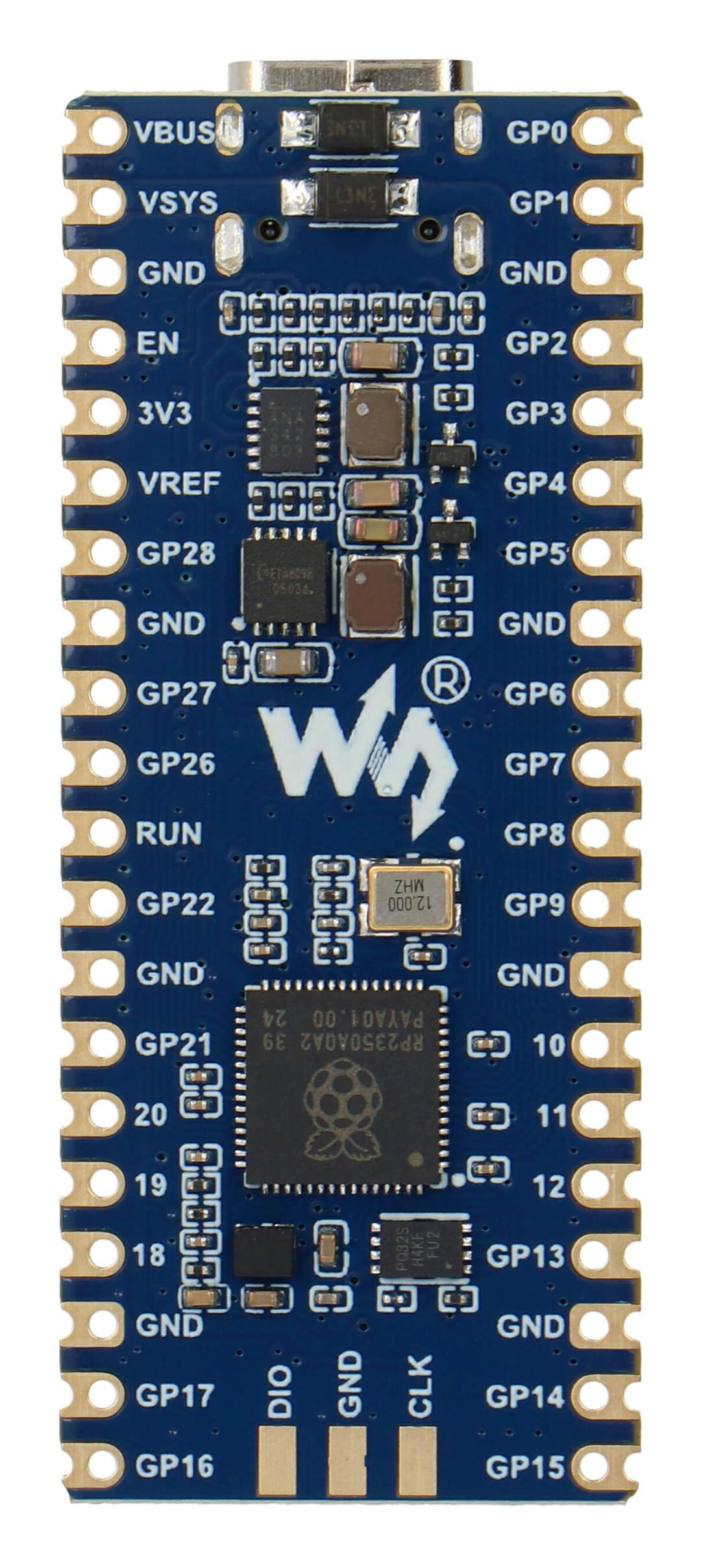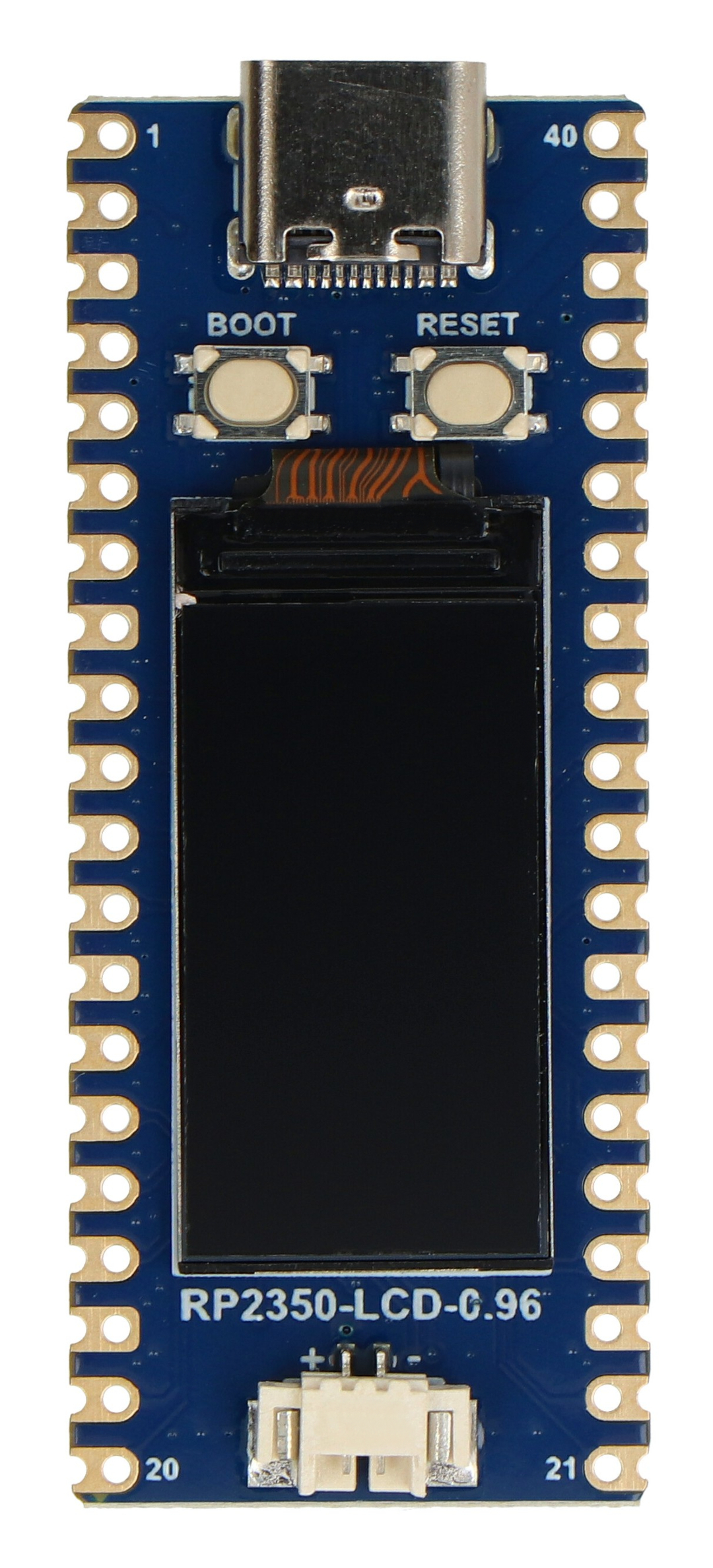 RP2350-LCD-0.96 je vysoce výkonná, kompaktní vývojová deska Pico založená na mikrokontroléru Raspberry Pi RP2350A. Deska nabízí bohatou sadu digitálních rozhraní a podporu pro C/C++ a MicroPython . Je vybavena 0,96palcovým IPS displejem s rozlišením 160 x 80 pixelů a 65 tisíci barvami , což umožňuje prezentaci informací jasným a vizuálně atraktivním způsobem. V kombinaci s konektorem pro lithium-iontovou baterii (MX1.25) může RP2350-LCD-0.96 fungovat jako přenosné zařízení a zároveň nabíjet baterii a napájet desku.