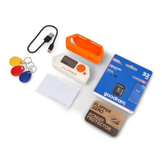 Tato sada byla navržena tak, abyste mohli bezpečně využívat všechny funkce zařízení Flipper ihned po vybalení. Pro provoz systému a ukládání databáze signálů je vyžadována přiložená 32GB microSD karta. Speciální oranžové silikonové pouzdro a sada ochranných fólií účinně chrání zařízení před pády a poškrábáním během práce v terénu. Sada pěti RFID štítků vám navíc umožňuje okamžitě otestovat funkci klonování, aniž byste museli hledat externí cíle.