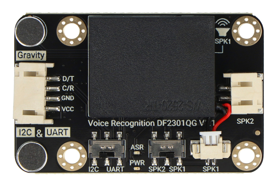 Modul rozpoznávání hlasu – Gravity Offline Language Learning Voice Recognition Sensor – umožňuje rozpoznat 121 hlasových příkazů uložených v paměti a také ji rozšířit o 17 vlastních zvuků, včetně tleskání, pískání a dokonce i zvuků zvířat. Senzor funguje bez připojení k internetu, což výrazně zjednodušuje jeho použití. S mikrokontrolérem komunikuje přes I2C nebo UART . Podporuje platformy jako Arduino , Raspberry Pi , FireBeetle a další. Má vestavěný mikrofon a reproduktor a také konektor pro externí reproduktor 8 Ω, 3 W. Zdroj zvuku a komunikační rozhraní se volí přepínačem umístěným na desce.