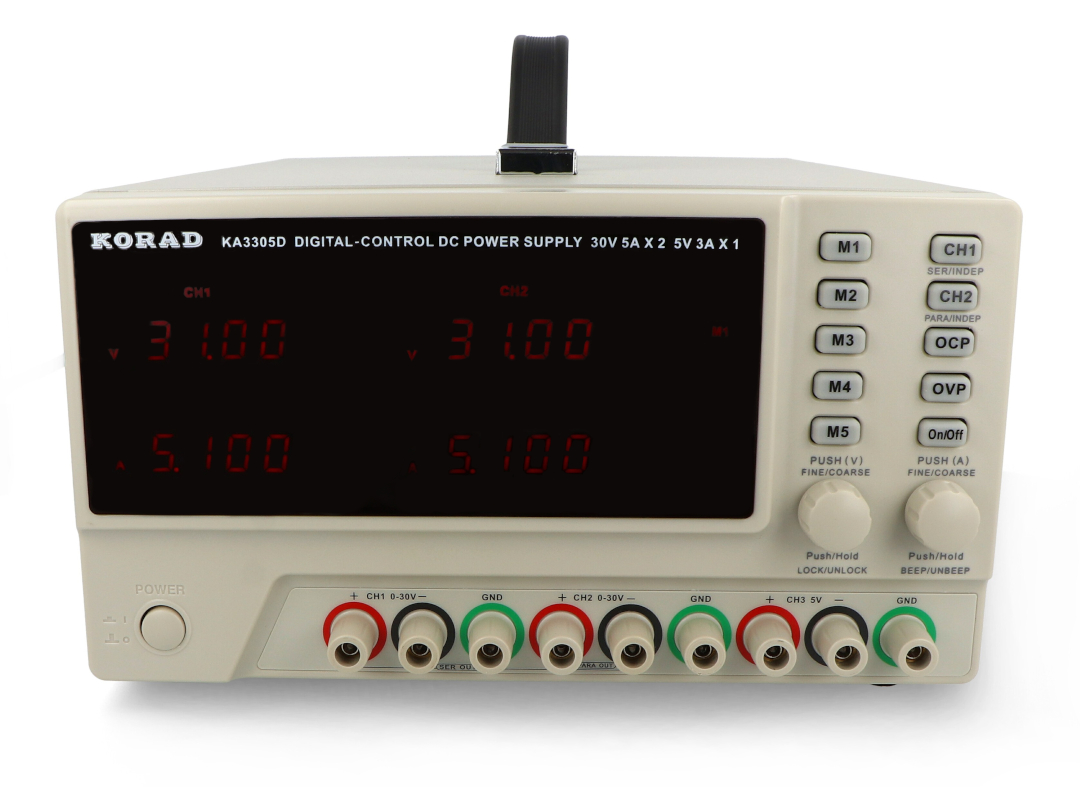 KA3305D je trojitě stabilizovaný laboratorní zdroj s programovatelnou pamětí a plynulou regulací napětí v rozsahu 2x od 0 do 30 V a proudu v rozsahu od 0 do 5 A a jedním výstupem 5 V / 3 A.