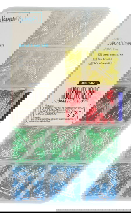 Sada 3mm LED diod je kompletní sada ideální pro elektronické inženýry, kutily, servisní techniky a elektronické designéry . Sada obsahuje 1 000 LED diod o průměru 3 mm , rozdělených do různých barev, což umožňuje širokou škálu aplikací v oblasti osvětlení, signalizace a dekorativních projektů. Sada obsahuje 200 LED diod v pěti barvách: červená, zelená, žlutá, modrá a bílá. LED diody se vyznačují nízkou spotřebou energie, vysokým jasem a dlouhou životností, díky čemuž jsou spolehlivé při každodenním používání.