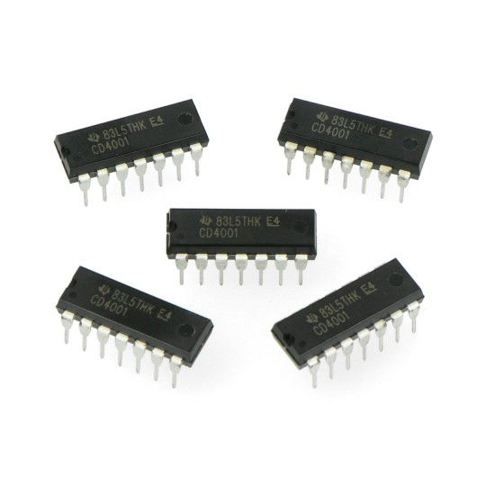 Logický obvod 4 x hradlo NOR v pouzdře DIP14 . Určeno pro montáž do průchozího otvoru THT . Provozní napětí systému je od 3 V do 18 V. Produkt se prodává v sadě 5 kusů.