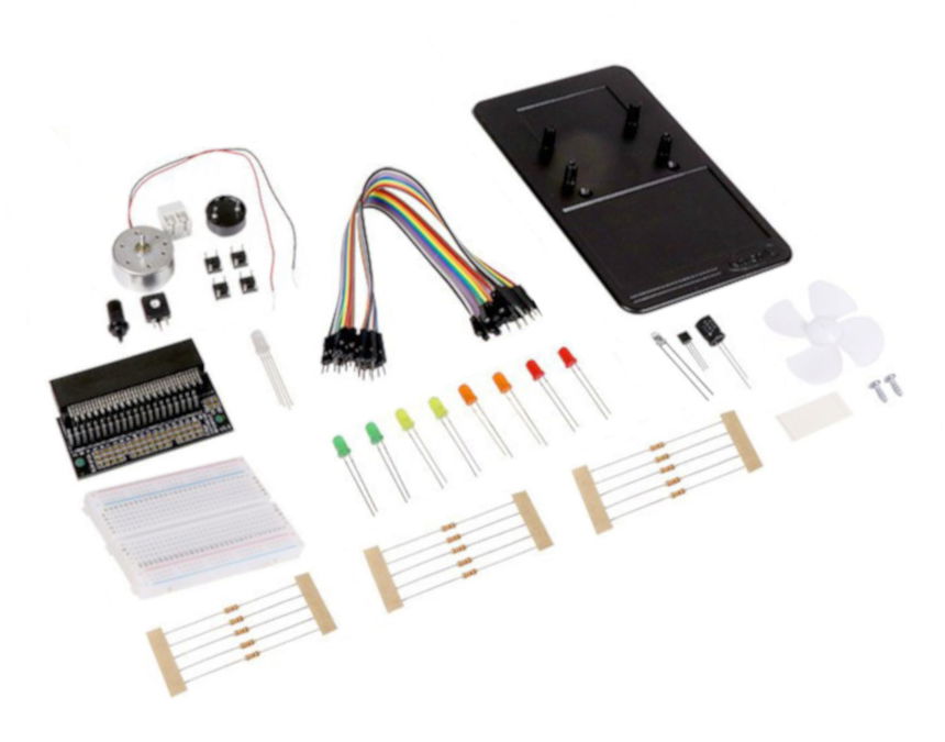 Sada elektronických součástek, které vám pomohou začít s BBC micro:bit . Sada obsahuje LED diody, motor, propojovací kabely, tlačítka, rezistory a další. Sada umožňuje provést 10 experimentů, které jsou součástí přiložené knihy. Modul BBC micro:bit není součástí sady.