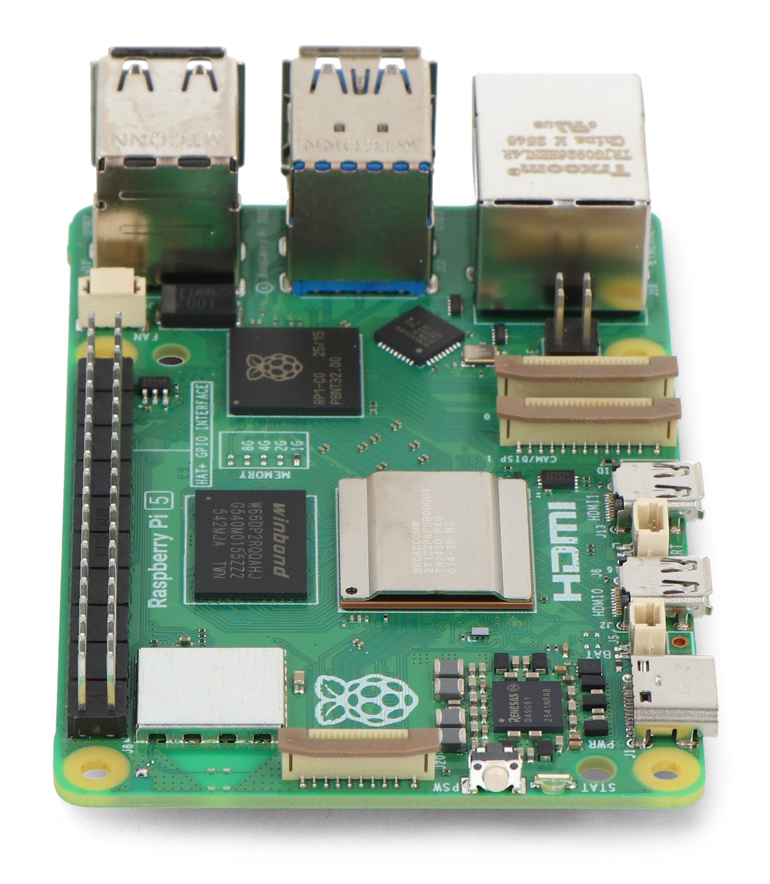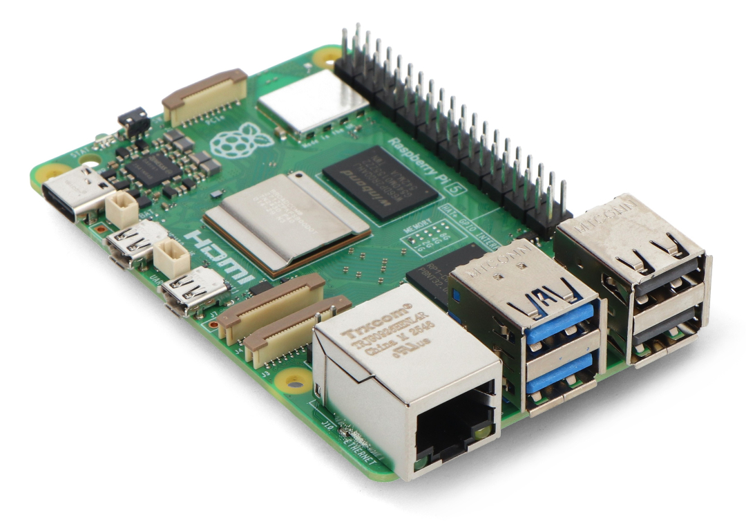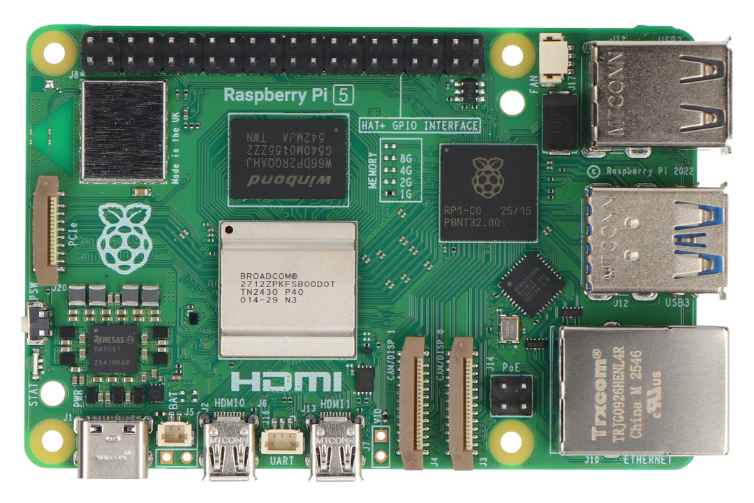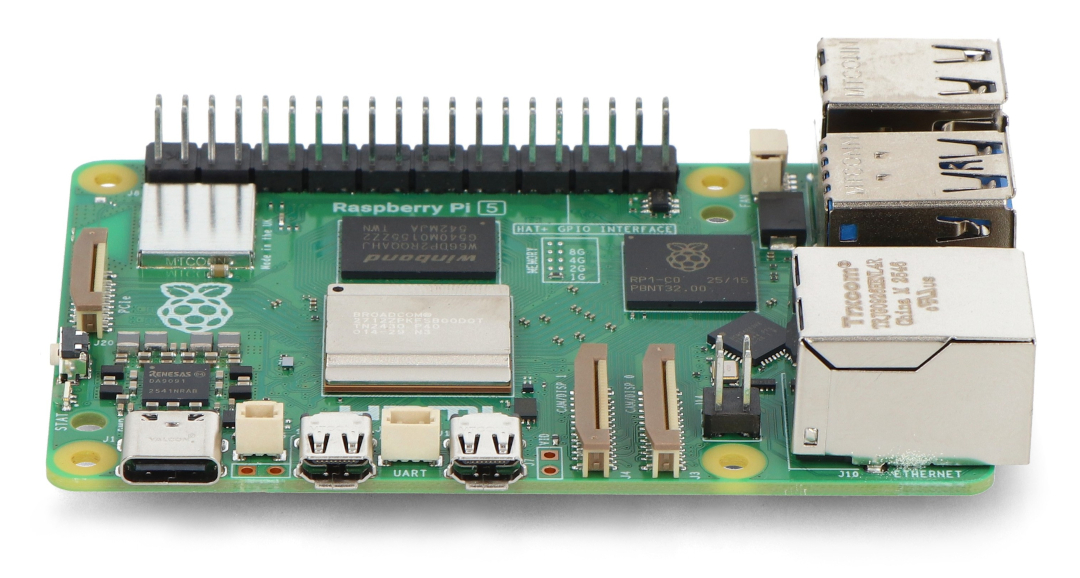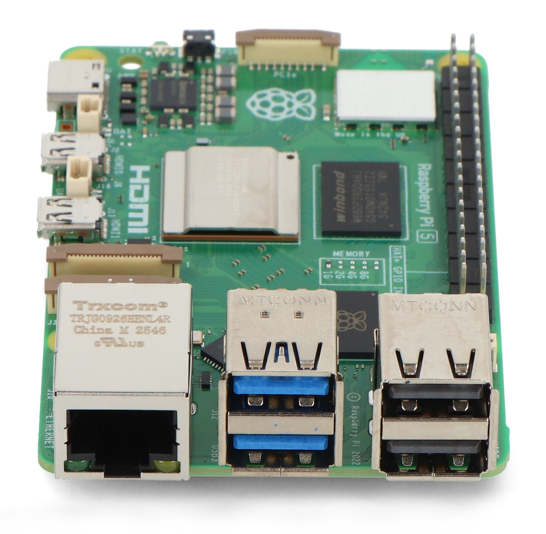 Raspberry Pi 5 , vybavený 1 GB RAM LPDDR4X-4267 , běží na 64bitovém čtyřjádrovém procesoru Broadcom BCM2712 ARM Cortex-A76 s frekvencí 2,4 GHz . Pátá verze populárního Raspberry Pi nabízí výkon, který je až 2–3krát rychlejší než Raspberry Pi 4. Standardní vybavení zahrnuje dva porty microHDMI , dva porty USB 3.0 , dva porty USB 2.0 a napájecí konektor USB-C. Raspberry Pi 5 má navíc dvě rozhraní MIPI DSI/CSI pro kamery a displeje, konektor PCI Express 2.0 , prostor pro ventilátor, konektor UART, patici pro baterii RTC a vyhrazené tlačítko napájení. Raspberry Pi 5 je také vybaven dvoupásmovou WiFi (2,4 GHz a 5 GHz), Bluetooth 5 BLE a gigabitovým ethernetovým portem s rychlostí 1000 Mbps s podporou PoE pomocí PoE+ HAT . Deska si zachovává standardní 40pinový GPIO konektor (2x20 pinů, rozteč 2,54 mm) a slot pro paměťovou kartu microSD , která podporuje operační systém. Kromě standardních montážních otvorů je zde prostor pro instalaci oficiálního chladiče s ventilátorem, což dále zvyšuje chladicí schopnosti během intenzivní práce.