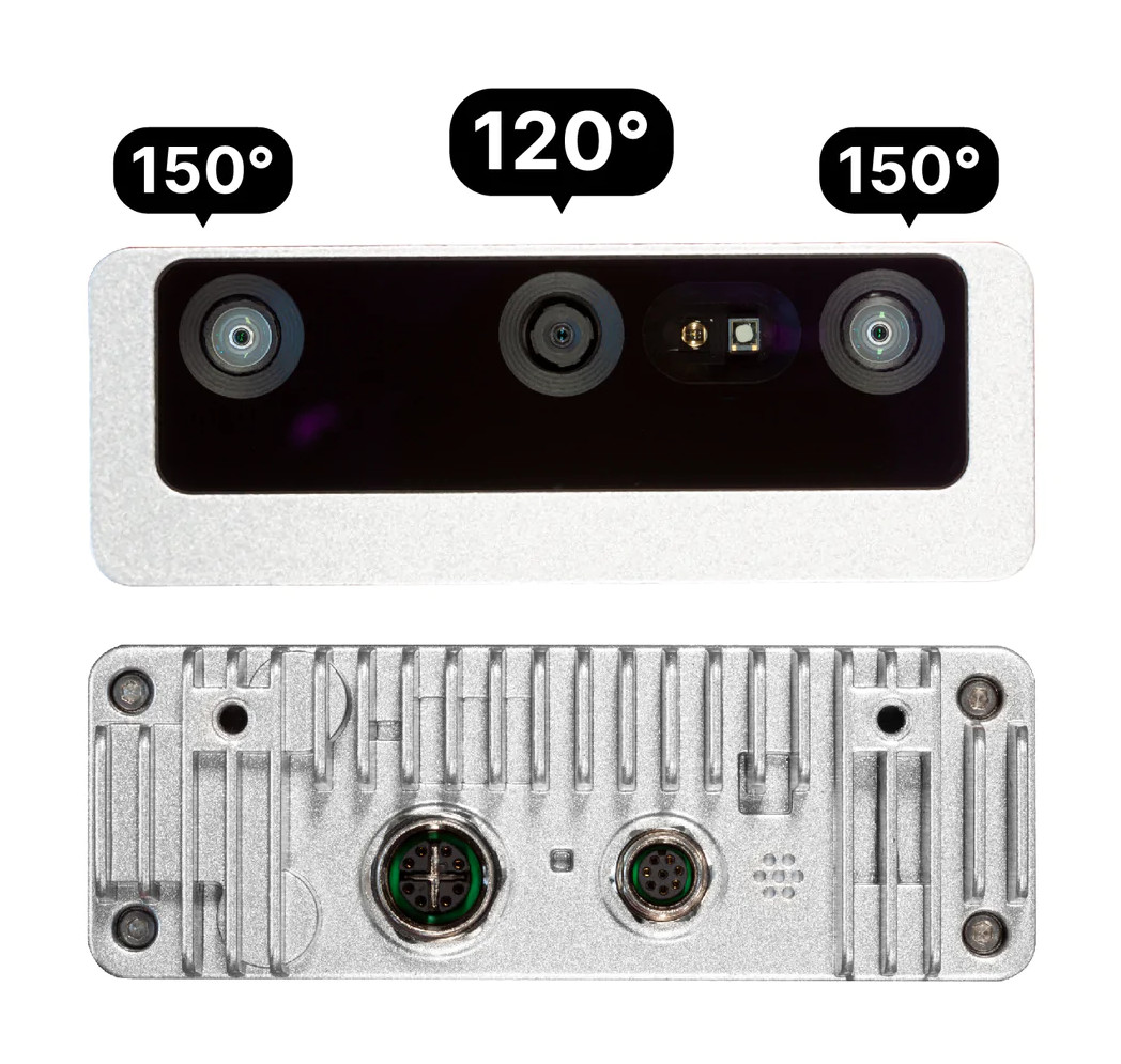 Oak-D Pro W PoE je kamera vyrobená společností Luxonis , která je součástí rodiny otevřených hardwarových inteligentních kamerových systémů poháněných koprocesorem Movidius Myriad X společnosti Intel. Nabízí 4 NEJLEPŠÍ výpočetní výkon a dává vám možnost provozovat jakýkoli model AI. Je vybaven IR LED (pro noční vidění) a IR laserovým bodovým projektorem (ve výchozím nastavení vypnuto), což umožňuje aktivní měření hloubky. Zařízení je vybaveno třemi kamerami - dvěma stereo kamerami OV9282 1280 x 800 px a jednou kamerou IMX378 Fixed-Focus pro pořizování barevných snímků v rozlišení 4032 x 3040 px. Luxonis Oak-D Pro W PoE využívá pro komunikaci a napájení technologii Power-over-Ethernet (PoE). Plně kompatibilní se standardy 802.3af a PoE Class 3 při rychlosti 1000BASE-T (1Gbps). Má průmyslový M12 PoE konektor (místo RJ45), přídavný M8 konektor pro IO konektivitu , USB 2.0 port (D+, D-), IOs konektor kamery (FSIN, STROBE), napájecí port a jeden pomocný GPIO.