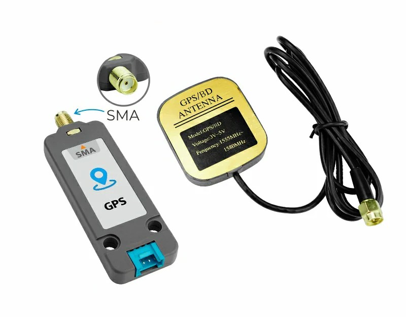 - Anténa: SMA, aktivní, zisk 30 dBi, od 1555 MHz do 1580 MHz, délka kabelu 1 m, rozměry 38 x 36 x 13 mm