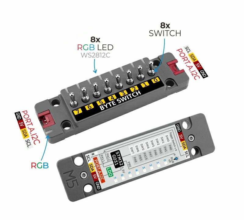 Unit ByteSwitch od M5Stack je pokročilý vstupní modul založený na mikrokontroléru STM32G031 . Deska obsahuje osm nezávislých přepínačů a devět RGB LED diod WS2812C, které dokáží dynamicky indikovat stav každého vstupu. Díky komunikaci I2C a dvěma konektorům Grove (Port.A) lze kaskádovat více modulů, což je ideální pro komplexní aplikace s více vstupy. Je navržen pro spolupráci s kontroléry M5Stack a je podporován UIFlow a Arduino IDE.