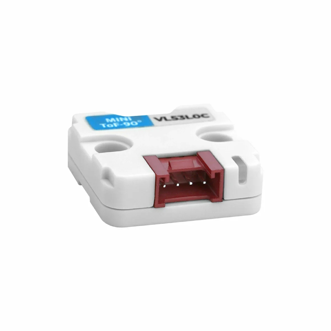 Mini ToF-90° je ultrakompaktní modul pro měření vzdálenosti v režimu Time of Flight (ToF) vybavený přesným senzorem VL53L0X. Otočením laserového modulu o 90° probíhá detekce horizontálně , což umožňuje aplikace vyžadující měření vpřed, jako je mobilní robotika nebo systémy pro vyhýbání se překážkám. Modul měří vzdálenosti od 3 cm do 200 cm s přesností ±3 % a rozlišením 1 mm . Jeho pozorovací úhel je 25° a doba odezvy je kratší než 30 ms. Jeho rozhraní I2C umožňuje snadnou integraci s oblíbenými vývojovými platformami.