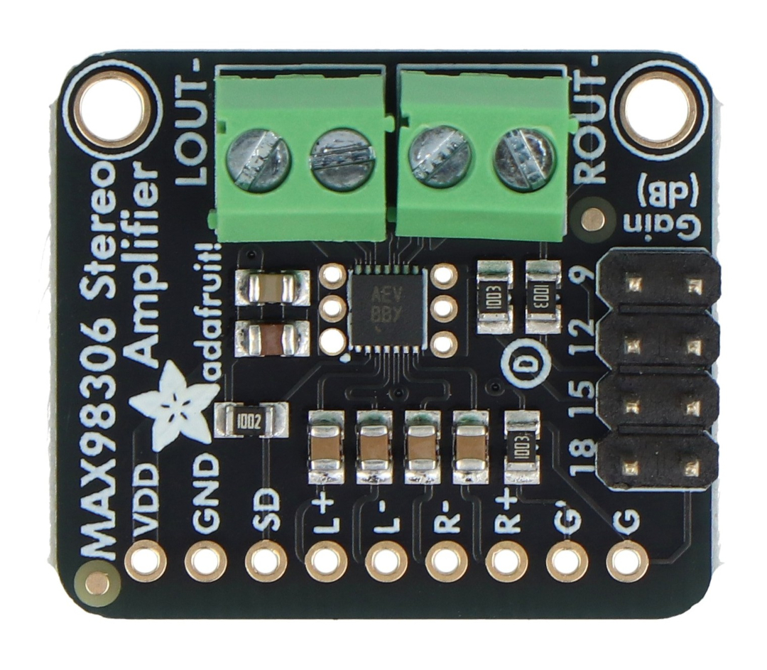 Modul audio zesilovače MAX98306 třídy D se vyznačuje nízkými ztrátami výkonu, což znamená nízkou tvorbu tepla, a dlouhou výdrží baterie. Lze k němu připojit 3Ω reproduktor s výkonem až 3,7 W.