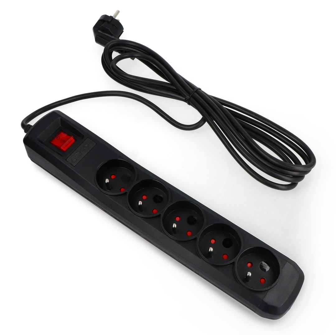 Černý prodlužovací kabel s 5 uzemněnými zásuvkami, podsvíceným hlavním vypínačem a odrušovacím filtrem. Výrobek je napájen ze síťového napětí 250 V. Odizolovací kabel je dlouhý 3 m . Proužek je univerzální a lze jej použít k napájení různých typů elektronických zařízení. Výrobek je chráněn proti zkratům a nebezpečným přepětím.