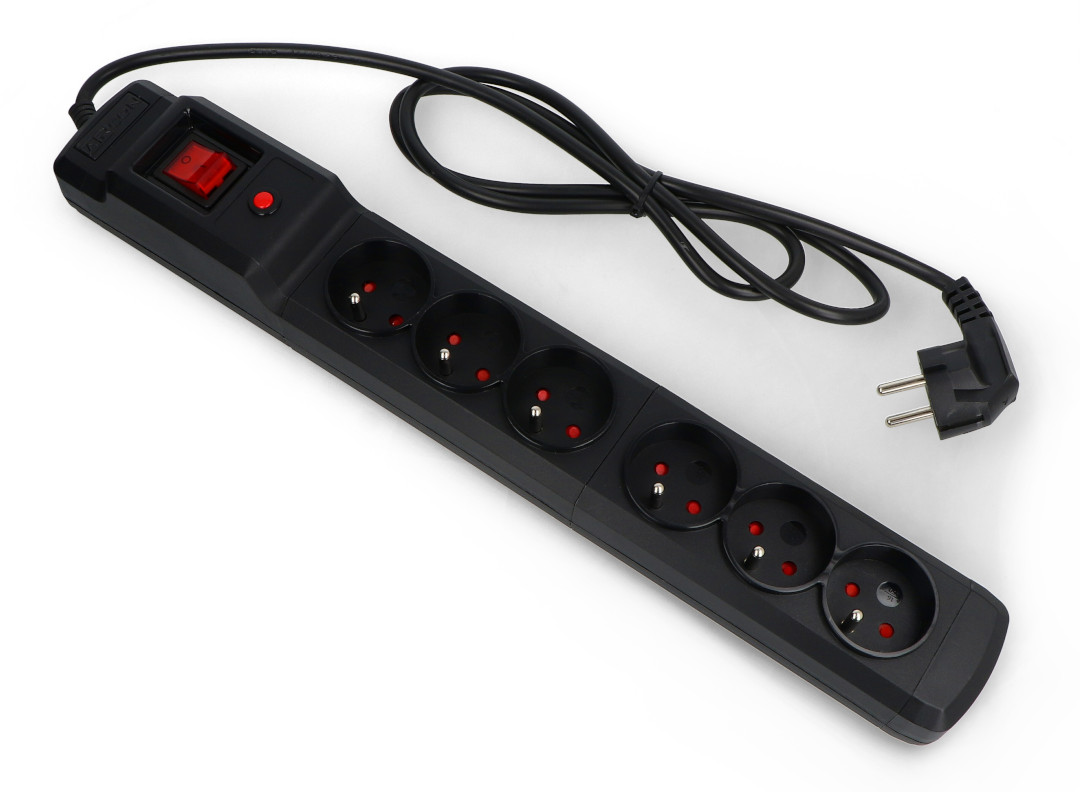 Černý prodlužovací kabel je vybaven 6 uzemněnými zásuvkami, osvětleným hlavním vypínačem a přepěťovou ochranou. Výrobek je napájen síťovým napětím 250 V. Páskový kabel je dlouhý 1,5 m . Pás je univerzální, lze jej použít k napájení různých typů elektronických zařízení. Výrobek má ochranné kryty síťových zásuvek.