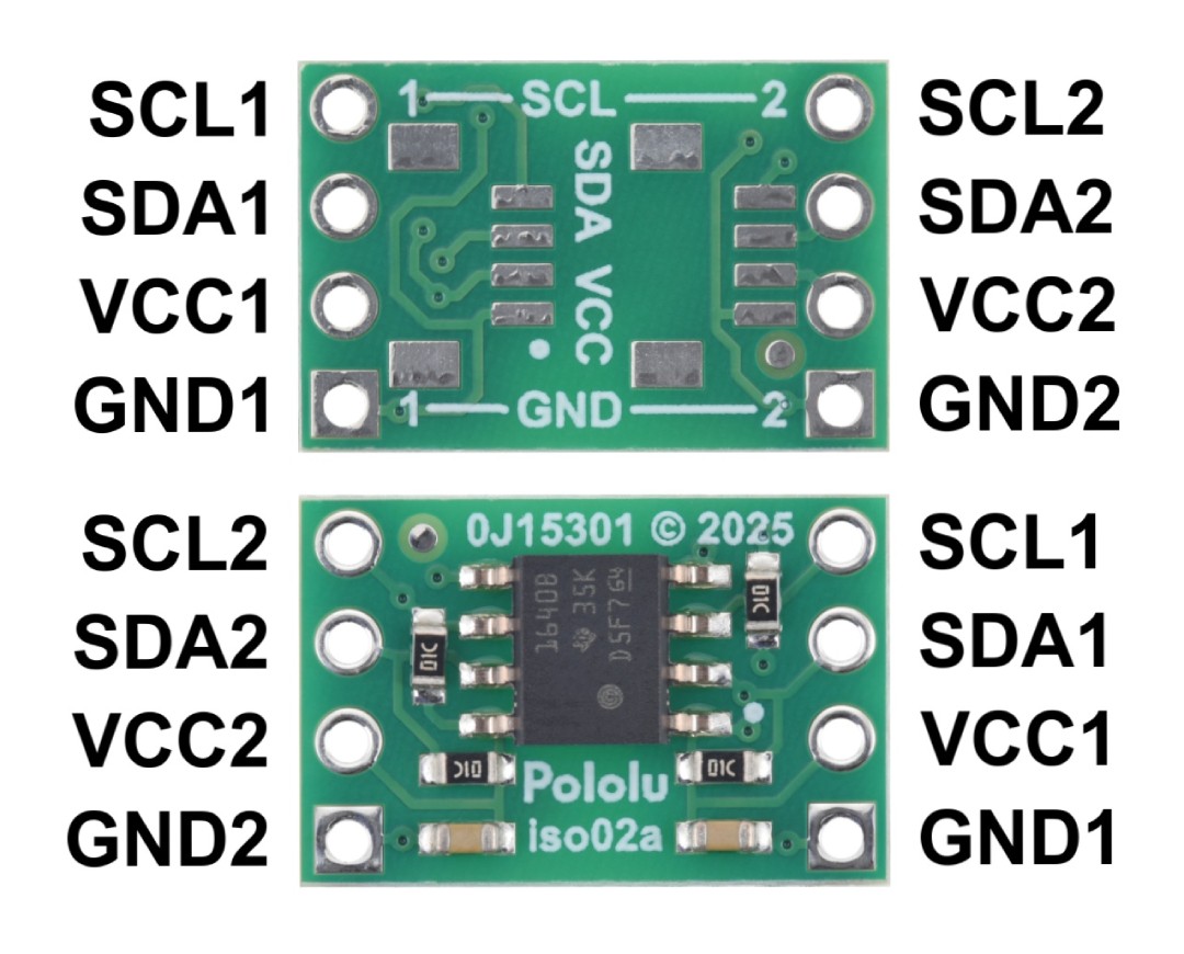 Modul má pájecí otvory rozmístěné každých 0,1'' (2,54 mm), což umožňuje připojení pomocí standardních konektorů Goldpin nebo přímé pájení vodičů. Strana 1 modulu ( VCC1, GND1, SDA1, SCL1 ) a strana 2 ( VCC2, GND2, SDA2, SCL2 ) jsou elektricky nezávislé a vyžadují samostatné napájení. Piny umožňují snadné připojení k jakýmkoli I2C zařízením na obou stranách izolátoru.