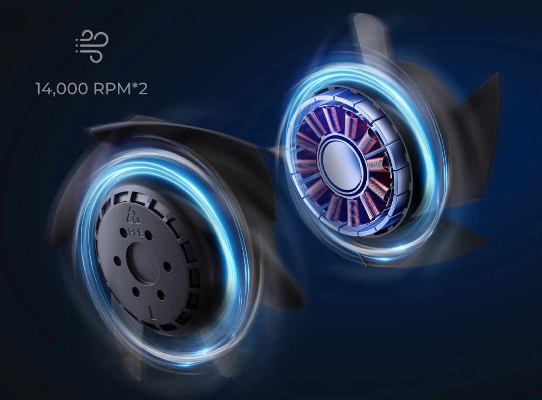- Duální ventilátor TurboBoost : Dvě oběžná kola s otáčkami 14 000 ot./min. generují silný proud vzduchu až 152 CFM