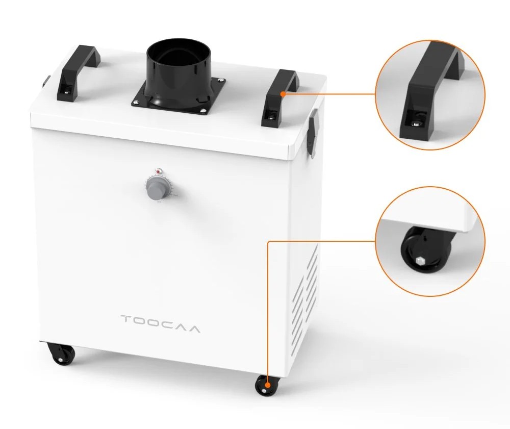 Čistička kouře TOOCAA účinně eliminuje kouř, prach a výpary vznikající při laserovém řezání a gravírování . Jeho třístupňový filtrační systém (předfiltr, filtr se střední účinností a vysoce účinný filtr s aktivním uhlím) zajišťuje čerstvý a bezpečný vzduch v dílně. Kompaktní pouzdro s rukojeťmi a kolečky usnadňuje přepravu, zatímco utěsněná konstrukce zabraňuje úniku kouře a zajišťuje vysokou provozní účinnost.