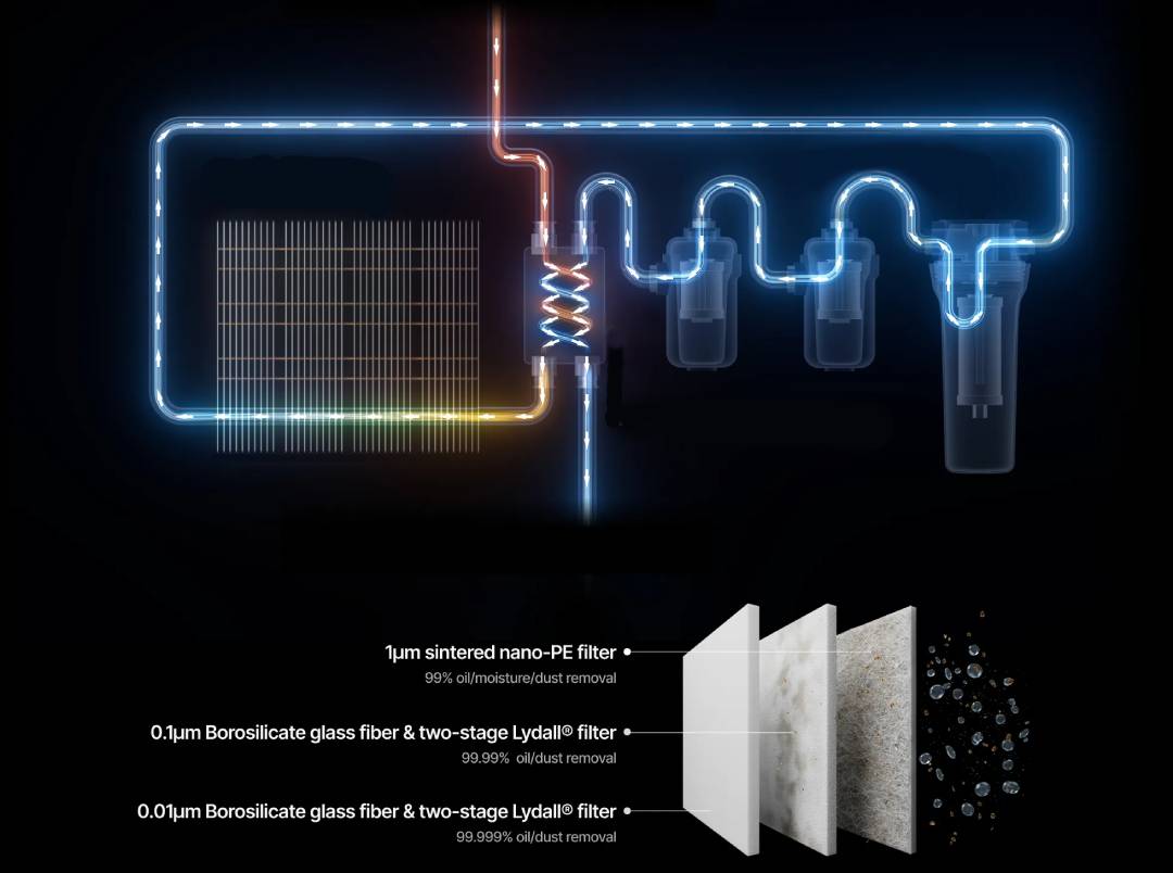 Vysoušeč, který je součástí sady, hraje klíčovou roli, protože samotná komprese vzduchu nestačí k dosažení dobrých výsledků při řezání kovu. Vzduch nasávaný z prostředí může obsahovat vlhkost, olejové částice, prach a částice rzi, které snižují kvalitu řezu, zvyšují kontaminaci systému a urychlují opotřebení pracovních částí. Sada proto obsahuje systém HyperPure , který připravuje vzduch pro práci s xTool MetalFab . Prvním stupněm je slinutý nano-PE filtr (1 µm) , který odstraňuje 99 % oleje, vlhkosti a prachu. Druhý stupeň využívá borosilikátové skleněné vlákno (0,1 µm) s dvoustupňovým Lydallovým filtrem, čímž dosahuje účinnosti 99,99 % . Finální bariéra s přesností 0,01 µm zajišťuje téměř úplné čištění vzduchu (99,999 %). Rosný bod udržovaný mezi 2 °C a 10 °C navíc pomáhá udržovat suchý vzduch, což je klíčové pro přesné řezání kovu. V praxi to znamená lepší kvalitu hran, menší riziko kontaminace v systému a stabilnější pracovní podmínky.
