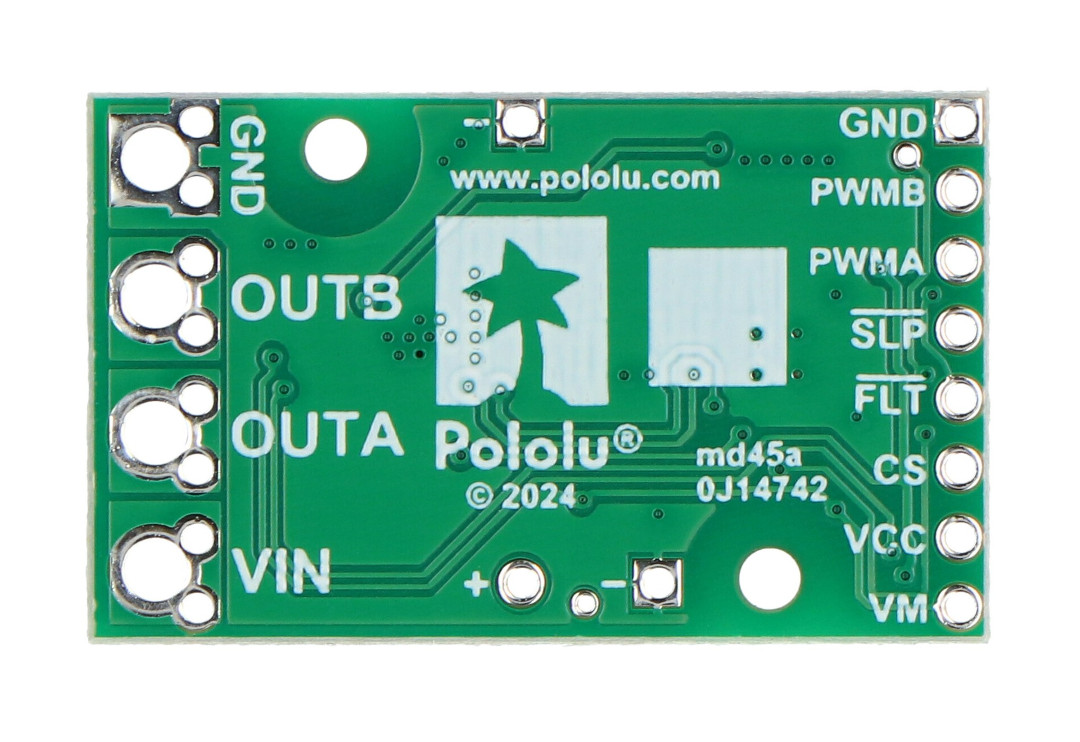 Řídicí jednotka je vybavena sadou pinů, které usnadňují integraci s řídicím systémem a motorem. Na straně napájení jsou piny VIN (vstupní napětí motoru), OUTA a OUTB (výstupní napětí motoru) a GND . Další piny VM, + a − se používají k připojení filtračního kondenzátoru. Na logické straně jsou k dispozici následující piny: PWMA a PWMB (PWM vstupy), SLP (spánek), FLT (signalizace chyb), CS (výstup proudového senzoru), GND a VCC (napájení logiky).