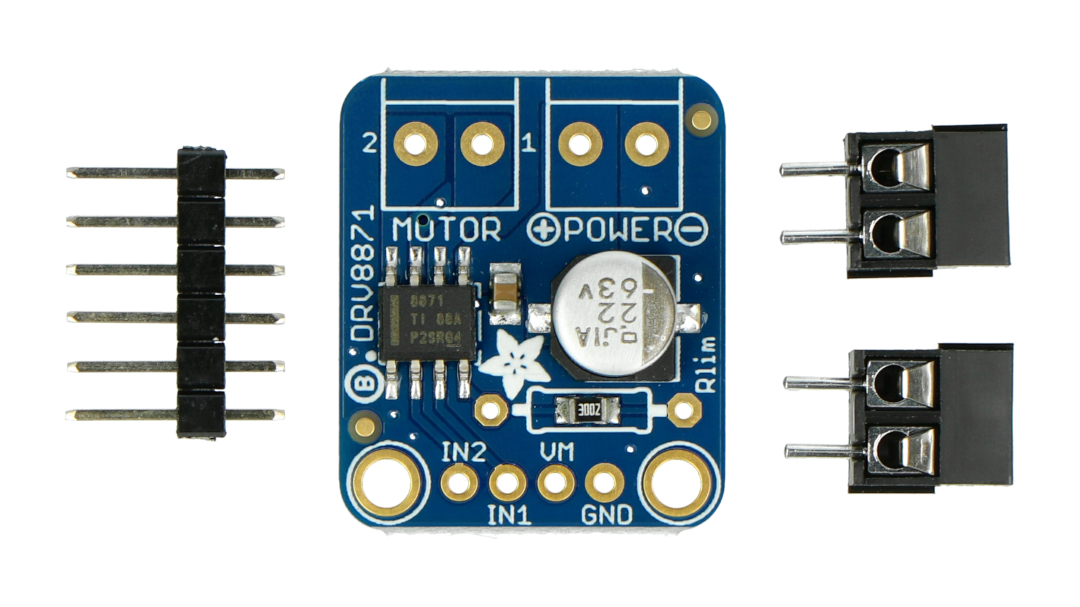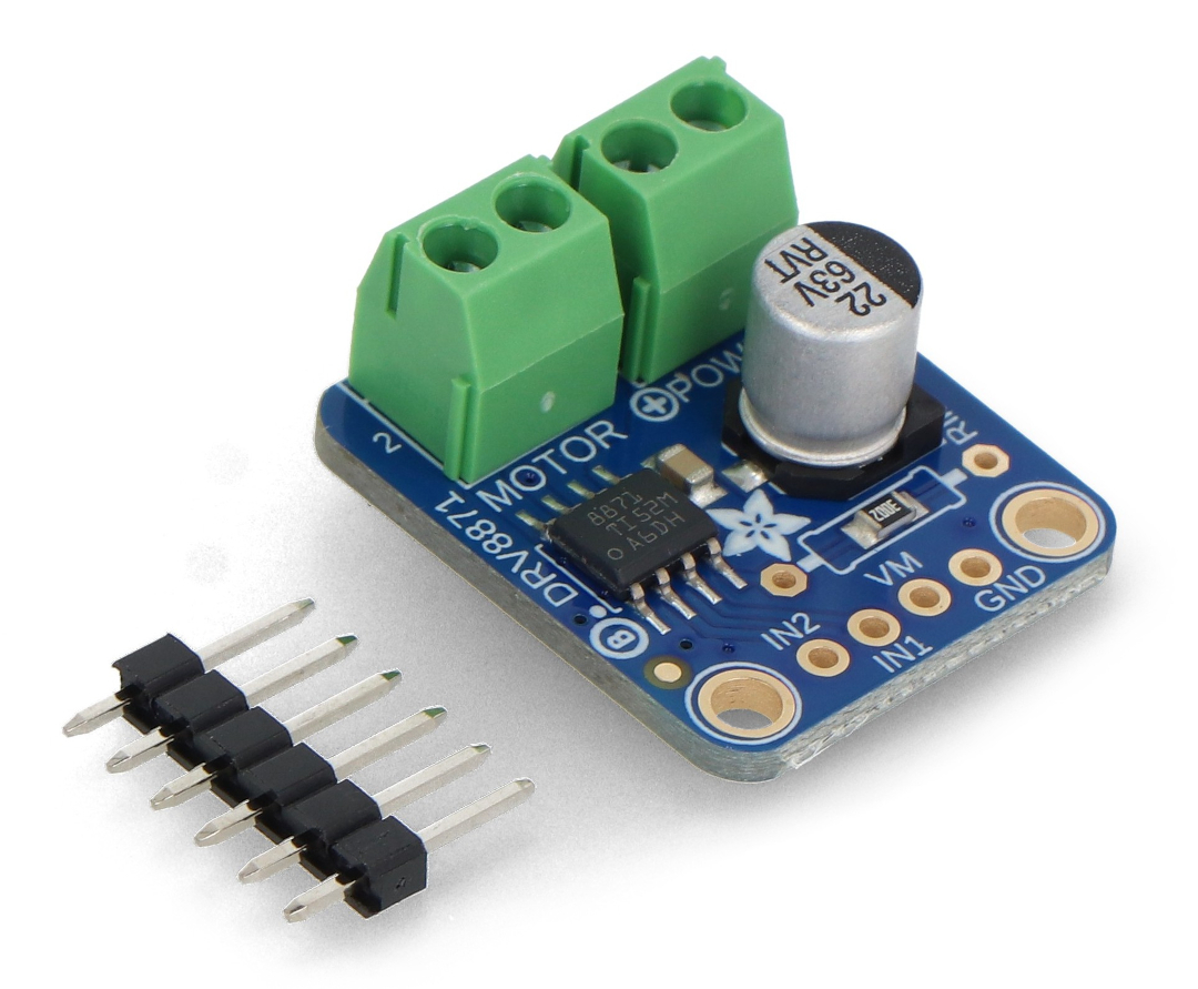 Tento modul založený na DRV8871 umožňuje ovládat jeden stejnosměrný motor. Motor může být napájen až 45 V s trvalým odběrem proudu až 2 A a špičkovým odběrem proudu (po dobu několika sekund) až 3,6 A. Před použitím doporučujeme prostudovat dokumentaci k DRV8871 .