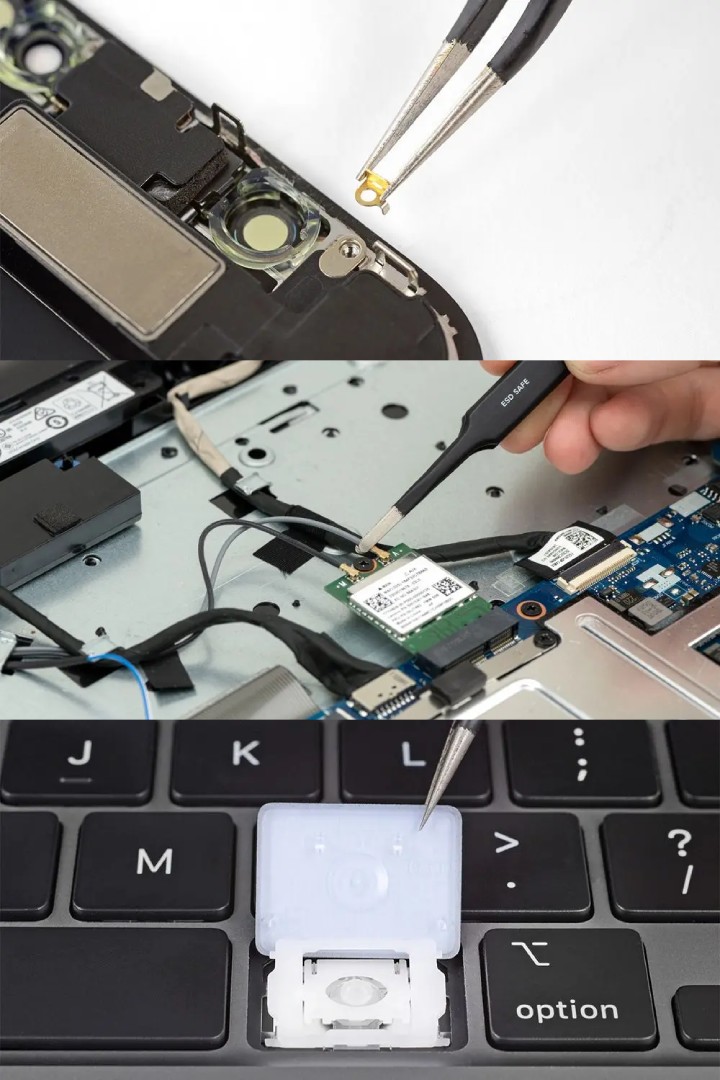 Sada obsahuje tři precizně navržené pinzety, které splňují různé potřeby uživatelů. Pinzeta se špičatou špičkou umožňuje extrémně přesnou manipulaci s mikroskopickými součástkami – ideální pro pájení a SMD osazování. Pinzeta se zkosenou špičkou se zakřivenou špičkou usnadňuje přístup k těžko dostupným místům a vodičům , zejména hluboko uvnitř pouzder zařízení. Pinzeta s tupou špičkou a drážkovaným úchopným povrchem je ideální pro silnější úchop – perfektní pro práci s většími součástkami nebo šrouby . Každý nástroj je pečlivě vyvážený a navržen pro pohodlné a dlouhotrvající používání.