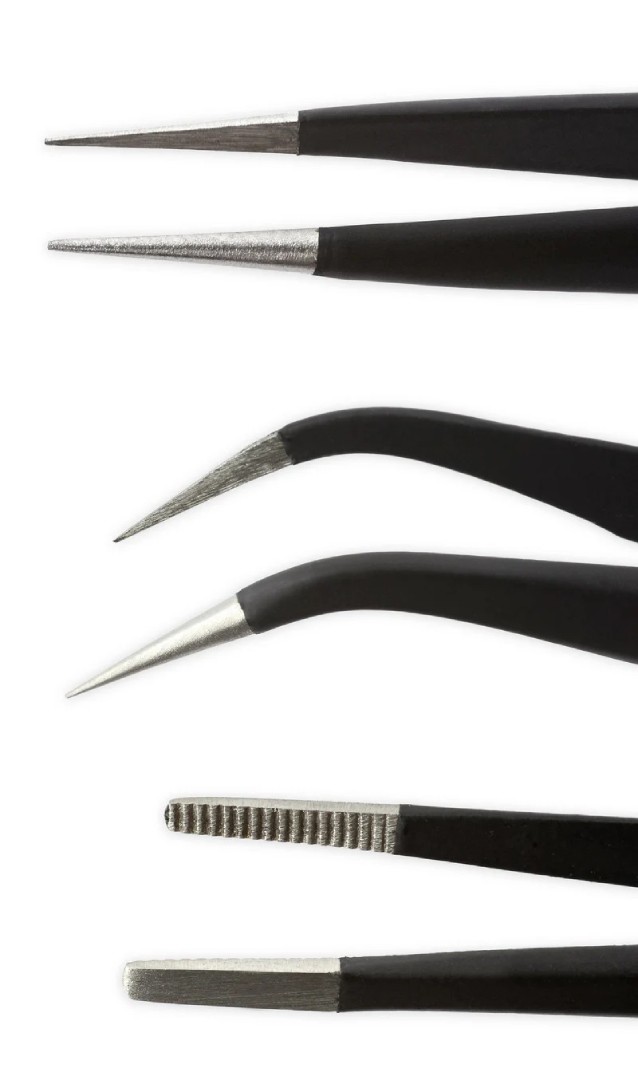- Tři přesné pinzety : různé hroty umožňují všestranné použití při různých úkonech