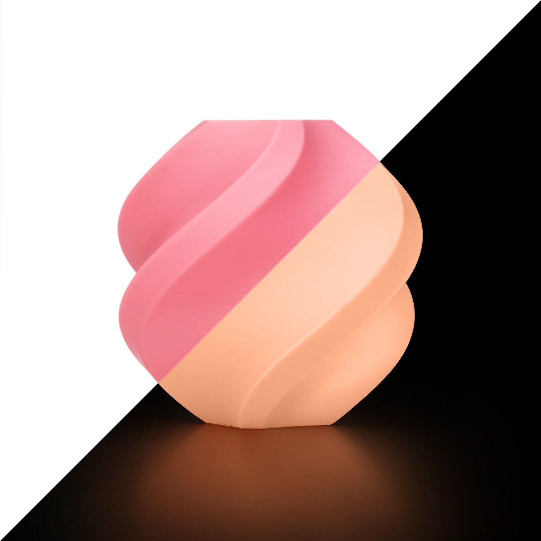 Růžový filament od Bambu Lab , vyrobený z materiálu PLA Glow , který svítí ve tmě. Výrobek je dodáván ve vakuovém obalu s opakovaně použitelnou cívkou. Určeno pro použití ve 3D tiskárnách pracujících v technologii FFF/FDM. Vložka je biologicky odbouratelná. Průměr vlákna je 1,75 mm a hmotnost materiálu je 1 kg .