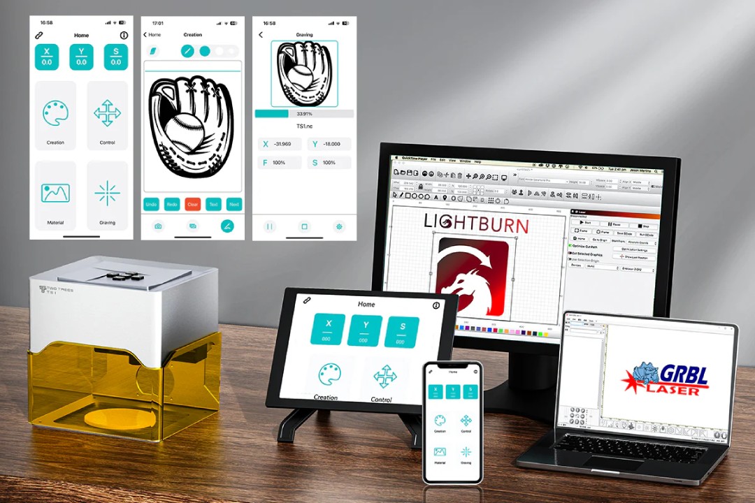 Gravírovací stroj TS1 Mini nabízí rychlý a jednoduchý pracovní postup – jednoduše jej připojte k chytrému telefonu nebo počítači, nahrajte svůj návrh a během několika sekund začněte gravírovat . Zařízení spolupracuje s oblíbenými programy, jako jsou Lightburn, LaserGRBL a MKSLaser (speciální mobilní aplikace). Uživatelské rozhraní aplikace je přehledné a umožňuje rychlé nastavení parametrů i pro ty bez zkušeností.