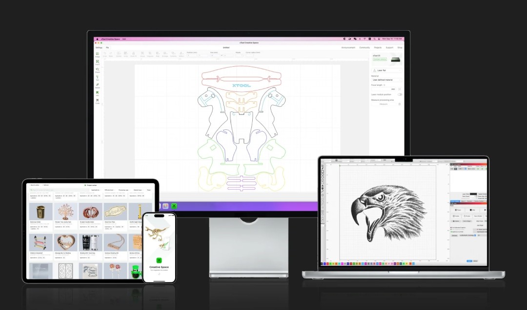 Zařízení xTool S1 spolupracuje s bezplatným softwarem xTool Creative Space (XCS) , který nabízí více než 1 000 předpřipravených návrhů, knihovnu tvarů a inteligentní funkce, jako je automatické ostření a porovnávání vzorů s materiály. Pokročilí uživatelé mohou využít oblíbený software LightBurn , který umožňuje plnou kontrolu nad parametry řezání a gravírování. Zařízení podporuje nejoblíbenější formáty souborů (SVG, DXF, JPG, PNG, BMP, TIF) a je kompatibilní s Windows, macOS, Androidem a iOS , což umožňuje pohodlnou práci z počítače, tabletu nebo chytrého telefonu.