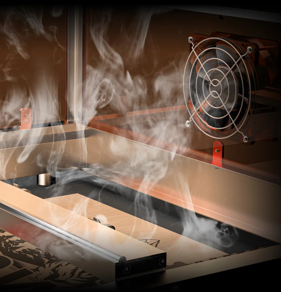 Plotter TOOCAA L2 má účinný systém odsávání kouře, který účinně filtruje a odstraňuje škodlivé výpary a prach vznikající během gravírování.
