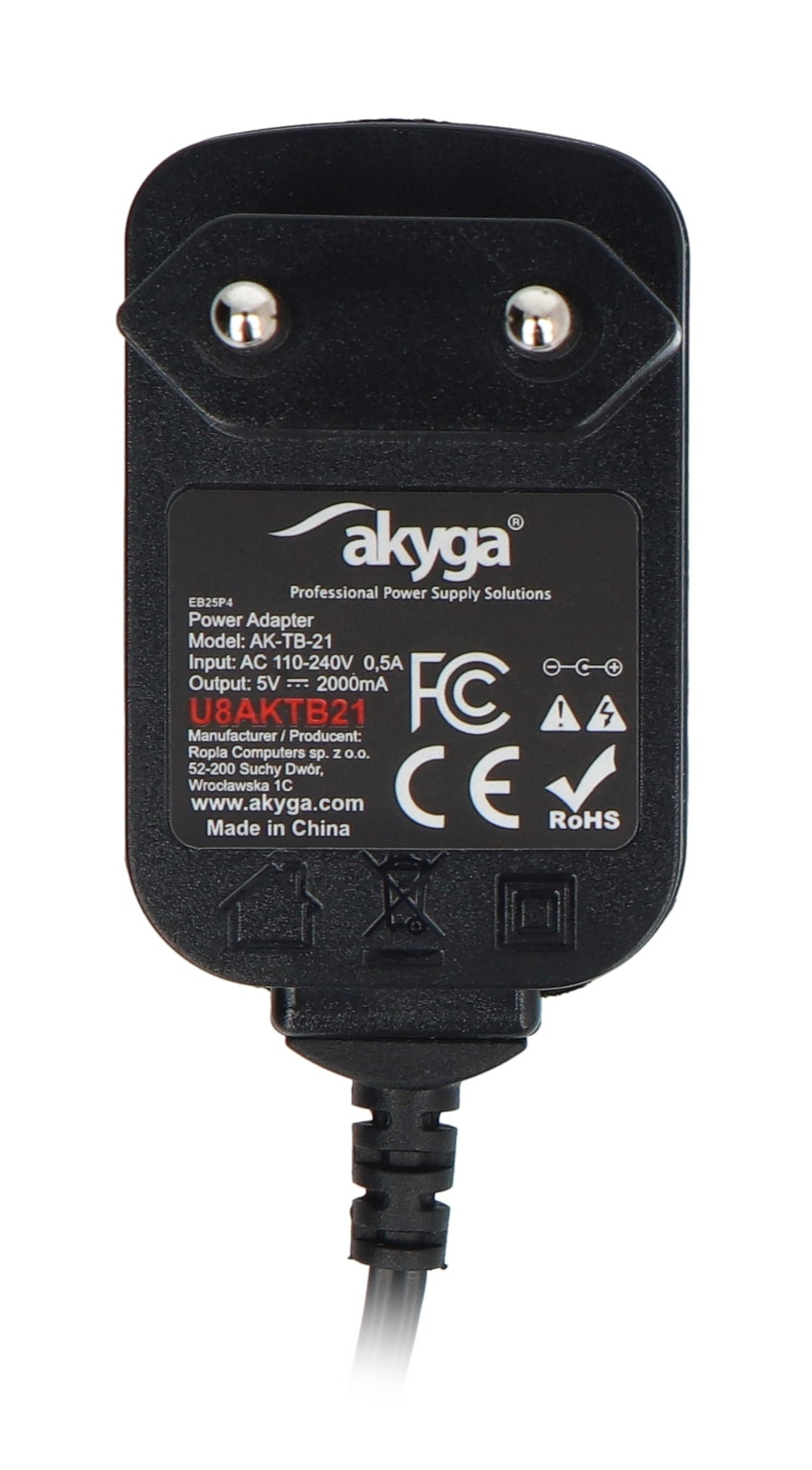 Popis produktu: Spínaný zdroj Akyga AK-TB-21 5 V / 2 A 10 W - DC zástrčka 2,5 / 0,7 mm