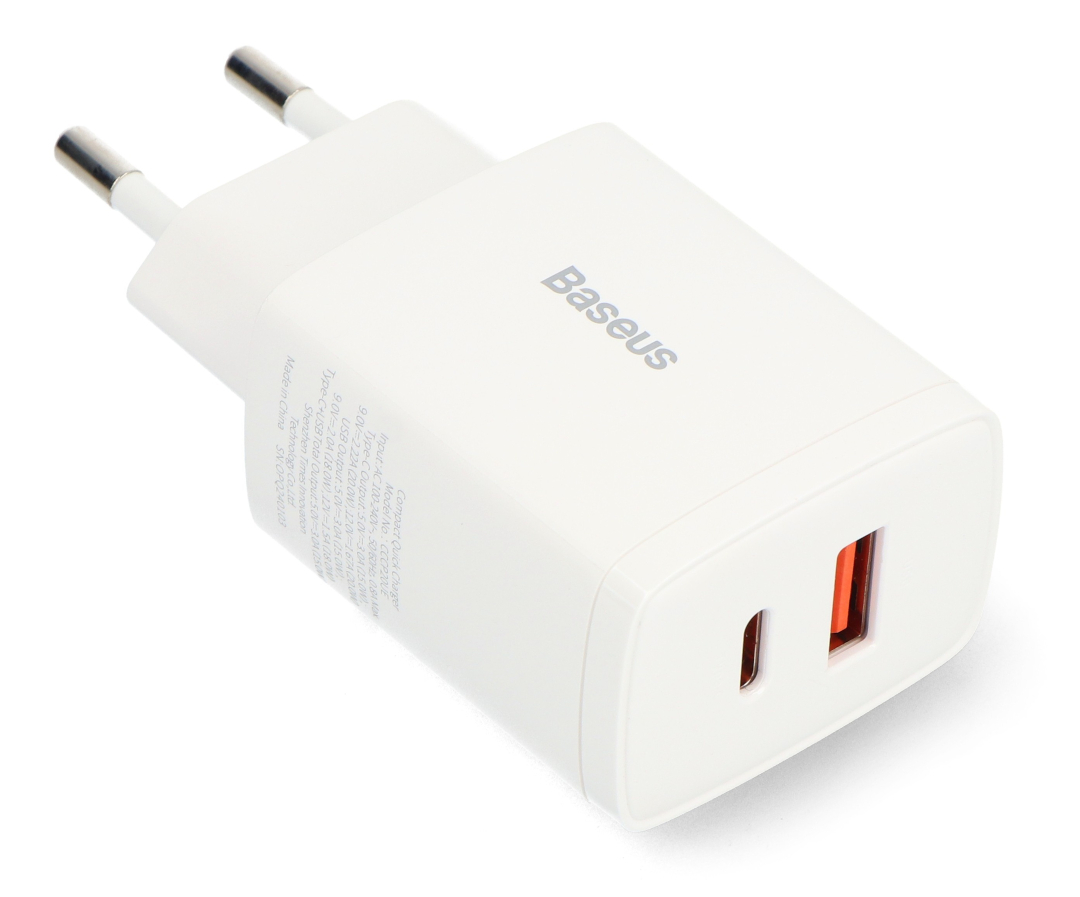 Napájecí adaptér Baseus Compact 20W je univerzální příslušenství pro rychlé a pohodlné napájení mobilních zařízení. Dva porty – USB typu C a USB typu A – umožňují nabíjet dvě zařízení současně z jedné zásuvky. Výstupní napětí je 5 V a maximální proudový výstup je 3 A. Podpora technologií Power Delivery 3.0 a Quick Charge 3.0 umožňuje efektivnínabíjení kompatibilních chytrých telefonů , tabletů a powerbank, zatímco inteligentní systém správy napájení volí optimální parametry pro připojené zařízení, bez ohledu na to, zda se jedná o zařízení se systémem Android, iOS nebo jiným. Kryt PC odolný vůči vysokým teplotám podporuje odvod tepla a kompaktní rozměry usnadňují přepravu.
