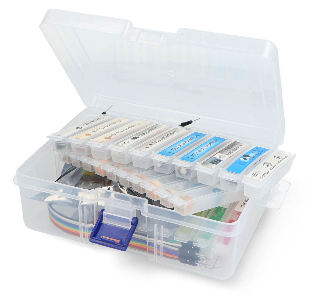 Sada obsahuje také mnoho menších součástek nezbytných pro vytváření obvodů, včetně různých typů rezistorů, LED diod v mnoha barvách, keramických a elektronických kondenzátorů a řady vodičů. Součástí je také praktická tabulka pro usnadnění identifikace součástek.