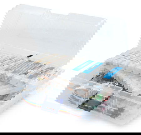 Elektronická stavebnice Arduino obsahuje 235 základních součástek, pečlivě sestavených. Jsou založeny na 400pinovém nepájivém desce, používaném pro prototypování obvodů, a zahrnují řadu dalších komponent. To vše je zabaleno v praktickém obalu.