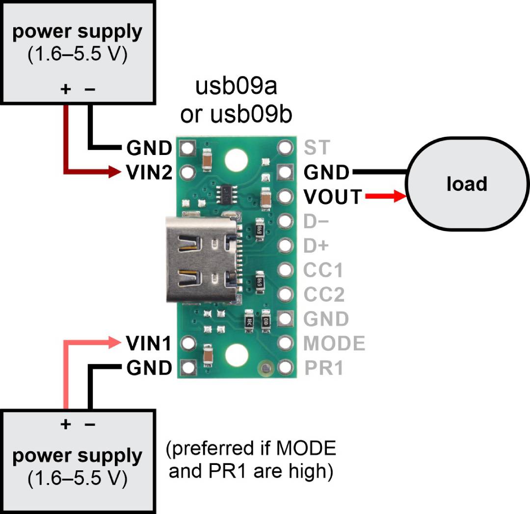 Ve výchozí konfiguraci je pin MODE nastaven na nízkou úroveň, takže obvod automaticky vybere zdroj napájení s vyšším napětím. To je užitečné pro zařízení, která je třeba napájet střídavě z USB a externího zdroje napájení bez nutnosti ručního zásahu uživatele. V tomto režimu probíhá přepínání plynule, což pomáhá udržovat nepřetržitý provoz připojeného přijímače. Pokud je pin MODE nastaven na vysokou úroveň, závisí výběr zdroje na signálu PR1 . U verze usb09b to znamená, že můžete nastavit prioritu pro vstup VIN1 , tj. externí zdroj napájení, zatímco záložním zdrojem bude napájení z USB typu C připojené k VIN2 . Během montáže nezapomeňte, že USB a VIN2 jsou propojeny, takže při současném použití USB připojte externí zdroj napájení pouze k VIN1 , abyste zabránili zkratu mezi zdroji.