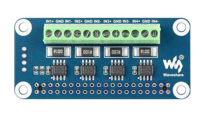 - Typ: 4kanálový HAT pro monitorování proudu, napětí a výkonu (DC)