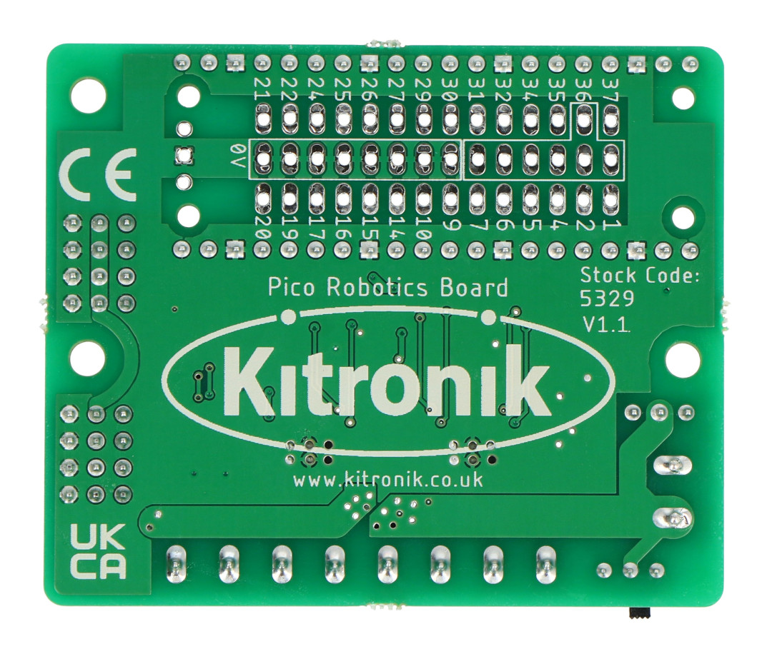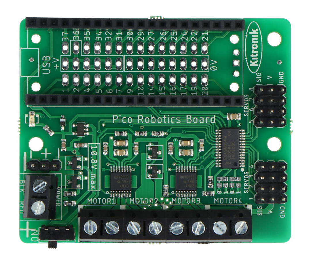 Modul vyráběný společností Kitronik ve formě ovladače pro motory a serva . Kitronik Robotics Board umožňuje ovládat čtyři stejnosměrné motory (nebo dva krokové motory ) a osm serv . Kromě toho má také 27 IO pinů , pomocí kterých můžete rozšířit funkčnost Raspberry Pi Pico . Maximální spotřeba proudu na motor je 1,5 A a maximální trvalý proud pro všechna připojená serva a motory by neměl překročit 12 A. Napájecí napětí prvků je v rozmezí od 3 V do 10,8 V. Důležité je, že ovladač umožňuje současné ovládání motorů vpřed, vzad a zastavení - to vše s úplnou kontrolou. Na druhé straně lze připojená serva ovládat pomocí rozhraní I2C. Ovladač navržený pro práci s verzí Rasppberry Pi Pico .