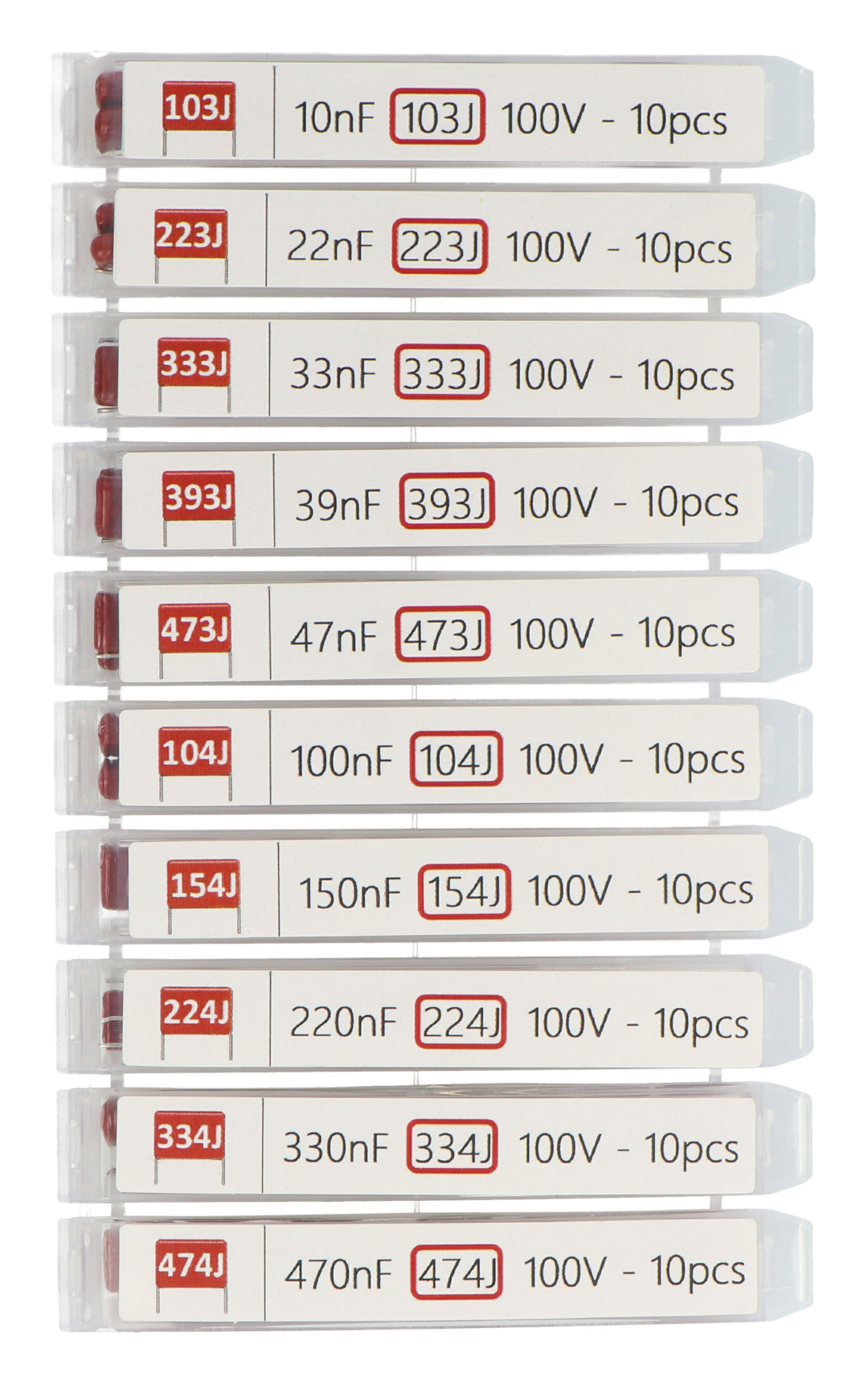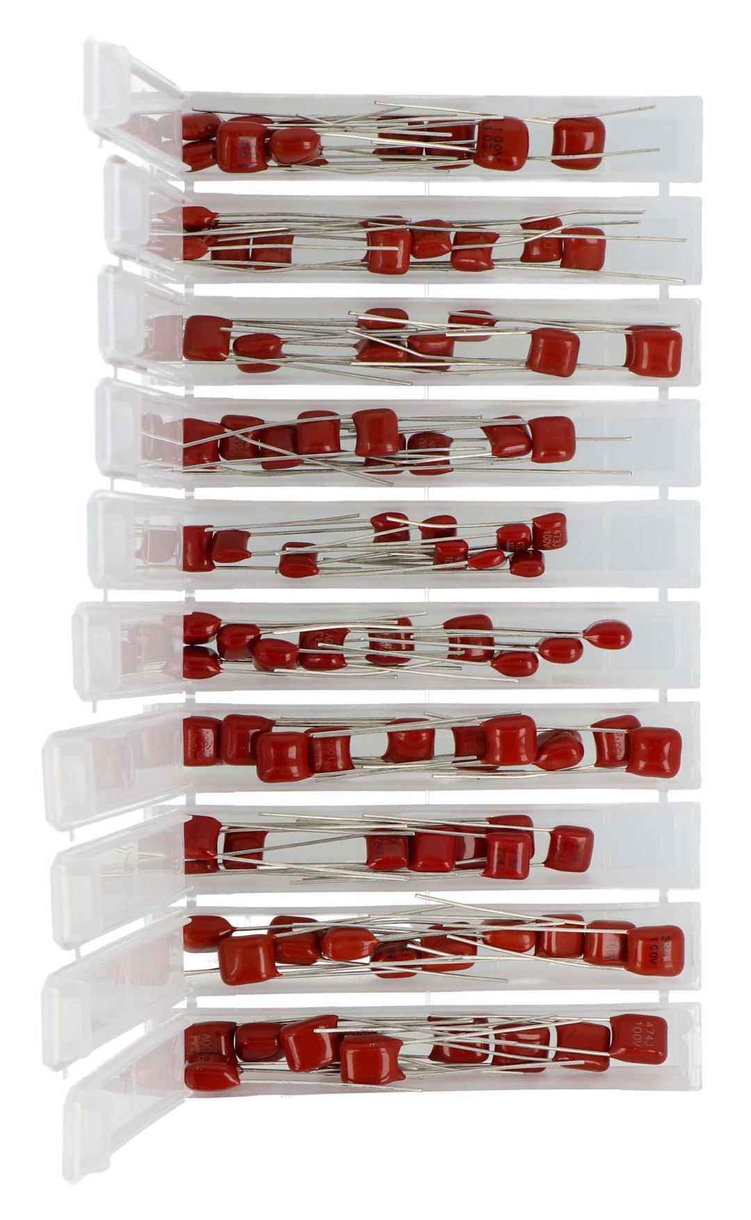 Popis produktu: Sada 100V polyesterových fóliových kondenzátorů - justPi - 100 ks + organizér