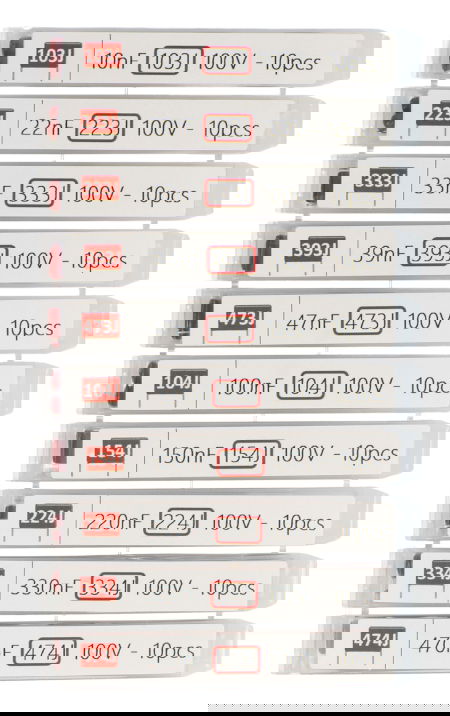 - Sada obsahuje 100 kusů polyesterových fóliových kondenzátorů o napětí 100 V s různými kapacitami.