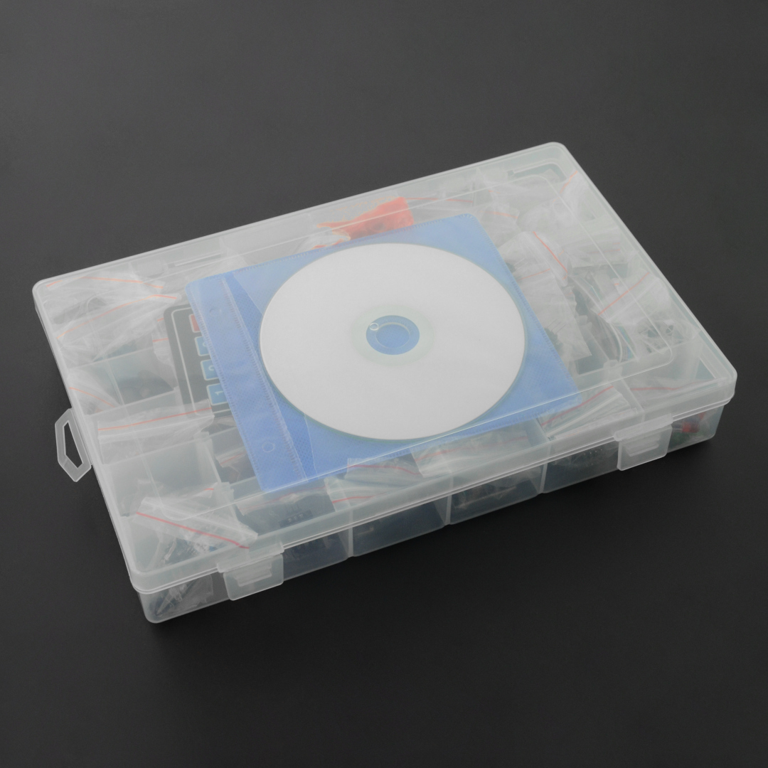 Sada senzorů s 65 díly pro Arduino a Raspberry Pi . Sada obsahuje senzor teploty a vlhkosti, senzor půdní vlhkosti, detektor kouře, displej, relé a další. To vše je uloženo v pouzdře.
