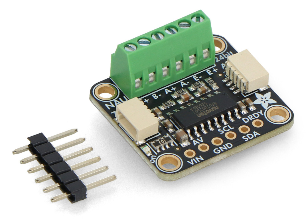 Tento modul Adafruit, vybavený obvodem NAU7802 , umožňuje čtení dat z tenzometrických nosníků . Obsahuje 24bitový diferenciální ADC s velmi vysokým rozlišením a dodatečným zesílením a kalibračními obvody. Připojení modulu k desce mikrokontroléru umožňuje čtení změny odporu nosníku a po kalibraci lze provádět přesné měření hmotnosti. Deska je vybavena konektory Qwiic, pájenými šroubovacími svorkami a pájecími ploškami pro konektor doldpin.