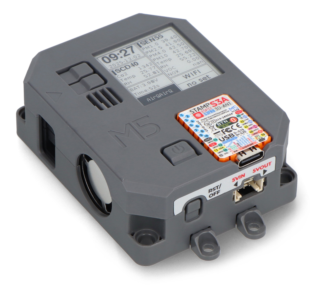 Air Quality je pokročilé zařízení pro monitorování kvality ovzduší, které kombinuje vysokou přesnost měření s energetickou účinností. Je vybaveno senzory SEN55 a SCD40 a monitoruje částice (PM1, PM2,5, PM4, PM10), teplotu, vlhkost, VOC a hladiny CO2. Vestavěný vývojový modul StampS3 (ESP32S3) zajišťuje bezproblémové zpracování a ukládání dat. Je vybaveno 1,54" e-ink displejem , baterií s kapacitou 450 mAh a systémem správy napájení s hodinami reálného času (RTC), což zajišťuje dlouhou provozní dobu. Air Quality se snadno instaluje a je dodáván s předkonfigurací pro synchronizaci s cloudem EZDATA , což umožňuje vzdálený přístup k výsledkům měření.