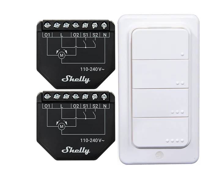 Popis produktu: Shelly Shutter + BLU RC Button 4 - 2x ovladač rolet + dálkové ovládání pro aktivaci akcí a scén - WiFi / Bluetooth