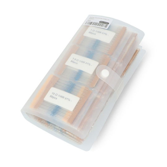 Sada 50 hodnot uhlíkových filmových rezistorů o výkonu 0,25 W s tolerancí 1 % , každá po 50 kusech. Součástky jsou označeny, což usnadňuje nalezení správné hodnoty. Sada obsahuje následující hodnoty: