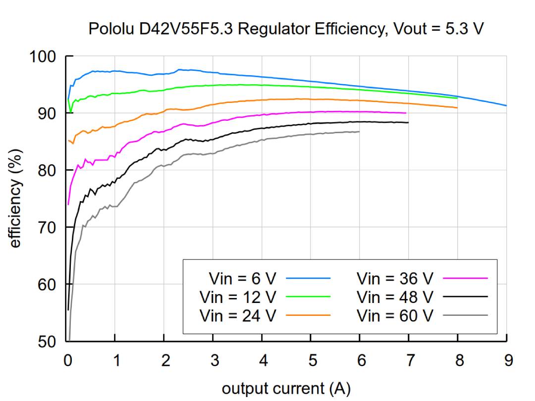 Měnič nabízí vysokou účinnost v rozmezí od 70 % do 95 % , což výrazně snižuje ztráty energie a tvorbu tepla. Maximální účinnosti je dosaženo při optimálním zatížení a mírném vstupním napětí. Maximální trvalý výstupní proud je až 6 A , ale jeho skutečná hodnota závisí na provozních podmínkách, jako je vstupní napětí, okolní teplota a způsob chlazení. Při vyšších vstupních napětích může být dostupný proud snížen v důsledku tepelných omezení.