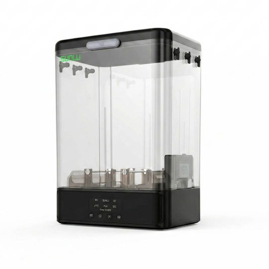 Sada Sunlu FilaDryer SP2 je praktické řešení 2 v 1, které kombinuje 3D sušičku filamentu s uzavřenou skladovací nádobou . Díky modulární konstrukci lze oddělit topnou základnu od boxu a samotný box může fungovat i jako nezávislá skladovací jednotka filamentu . Zařízení nabízí rozsah teplot sušení od 35 °C do 70 °C , což usnadňuje nastavení parametrů pro většinu oblíbených materiálů a provozních podmínek. Velká komora umožňuje sušit a skladovat cívky o rozměrech až 250 x 153 mm v konfiguracích 2 x 1 kg , 1 x 2 kg nebo 1 x 3 kg (v závislosti na provedení cívky). Box má navíc vestavěný vlhkoměr pro sledování vlhkosti a výstupní otvory pro filament umožňují tisknout bez otevírání komory , což snižuje riziko opětovného navlhnutí.